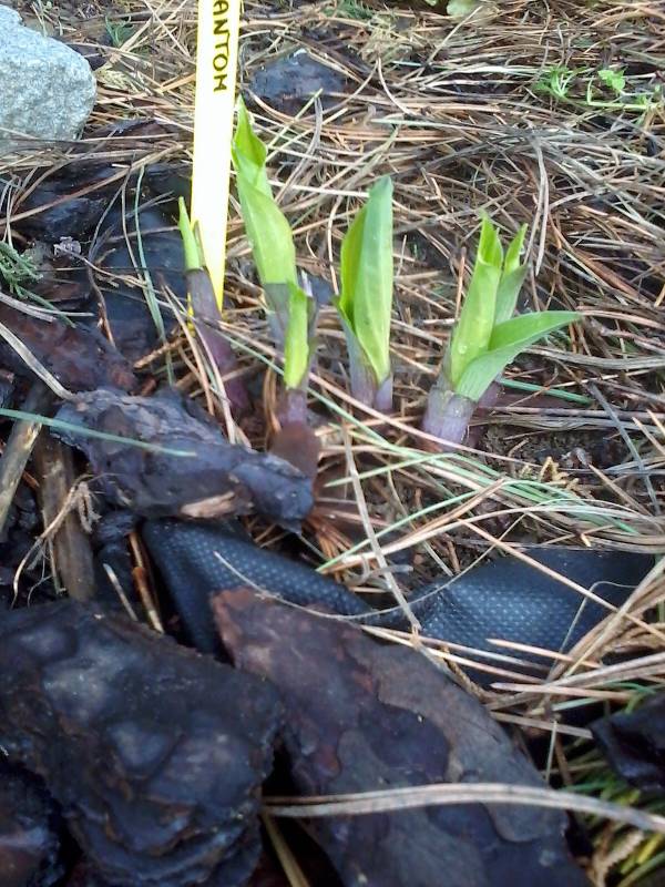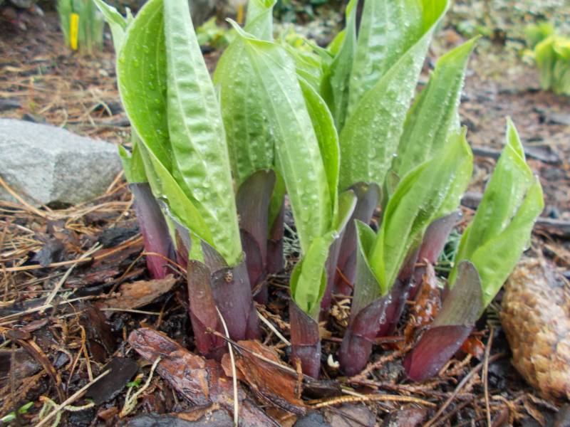 . Sadzoneczka przyszła marniutka, ale po 2 latach nabrała nieco ciałka. Dziś ma około 15 kłów. Na zdjęciu Halszki widać, jakie są fioletowe, gdy wychodzą z ziemi. Później ten kolor zostaje w nasadzie łodyg i pięknie współgra z kolorem liści.