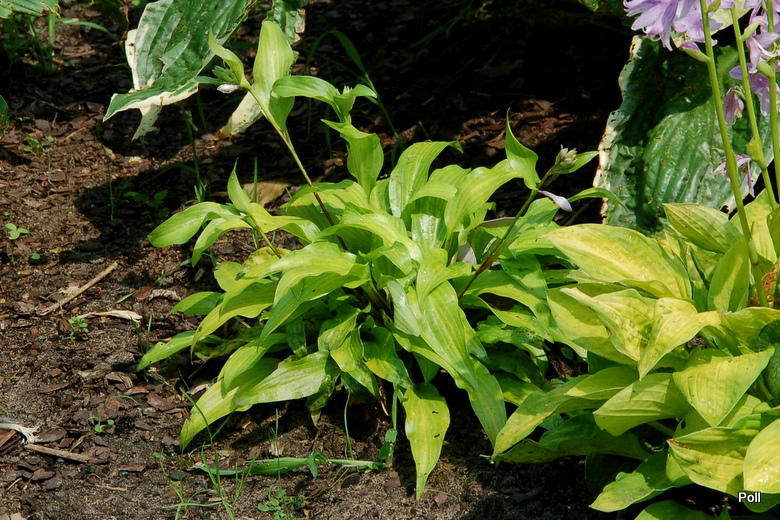 Obrana z przemarzniętych liści, spryskana środkami przeciwgrzybowymi, hosta Maya Tritone rozpoczyna kwitnienie
