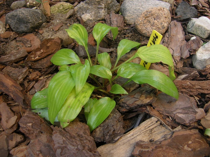 Rozmiar: S-M (od 30 do 35 cm wysokości) Liście: podłużne, lekko pofalowane, dość miękkie i słabej substancji; zmieniające kolor w trakcie sezonu od jasnozielonego i żółtego po kremowy, na tle blaszki liściowej widoczne jaśniejsze, kremowe unerwienie (liście wyglądają, jak paskowane wzdłuż) Kwiaty: lawendowe, Zalecane stanowisko: półcień do cienia