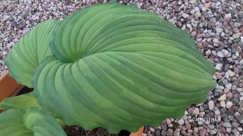 Hosta War Paint utraciła juz swoje wiosenne kolory. Obecnie kwitnie.