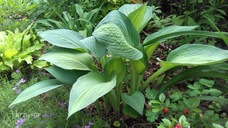 Nie bardzo mi się podobają hosty w tych kolorach, ale swoim tempem wzrostu, postawą , odpornością na ślimaki, prosionki i warunki zapracowała na jedną z ulubionych. Kupiona jesienią 2014 z 3 kłami, jeden ułamałam w trakcie sadzenia.