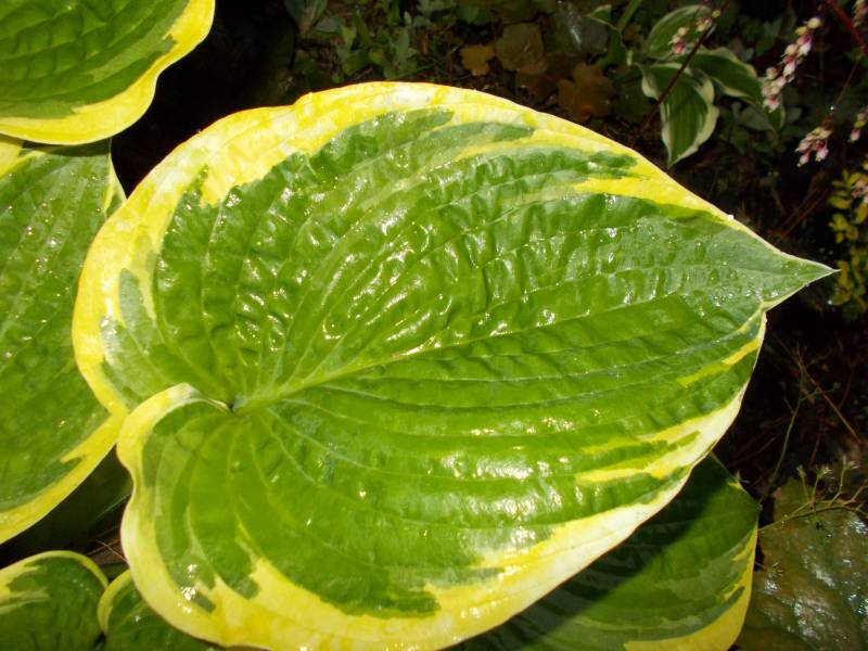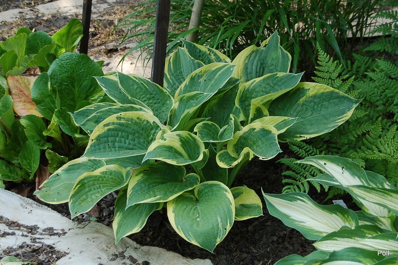 Rozmiar: ML (50-60 cm wysokości) Liście: sercowato-okragłe, grube, mocnej substancji; ciemnozielone z nieregularnym żółtym, bielejącym w trakcie sezonu, marginesem; błyszczące Kwiaty: bladolawendowe (VII) Zalecane stanowisko: od półcienia