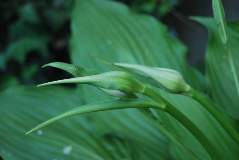 Liście: duże, błyszczące, jakby satynowe , z wyraźnie zaznaczonymi nerwami ; jasnozielone z pofalowanym brzegiem i ostrym, nieco zakręconym czubeczkiem
