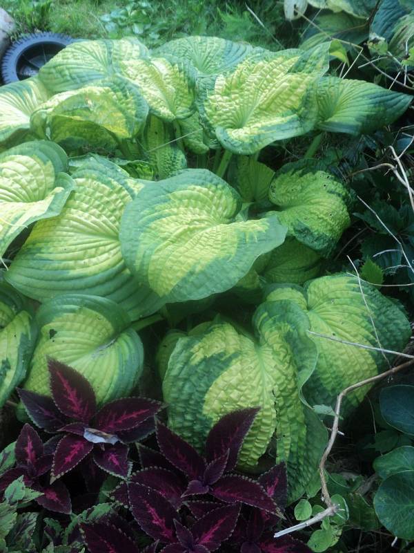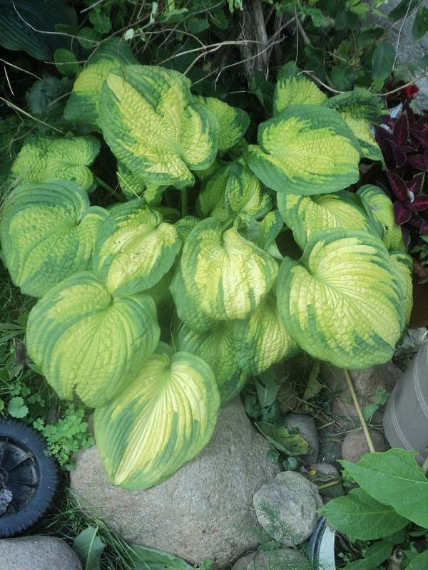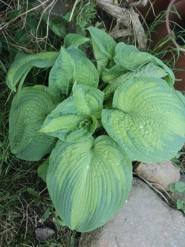 Przyznam, ze jest to najmniej mi się podobająca hosta z wszystkich intro Olgi Petryszyn. Rośnie w półcieniu rzucanym przez modrzewie, na miejscu dość szybko wysychającym, ale sporo podlewanym. Jak widać na fotce, niedawno zasiliłam ją azofoską. W sezonie dostaje jeszcze porcję gnojówki z chwastów.