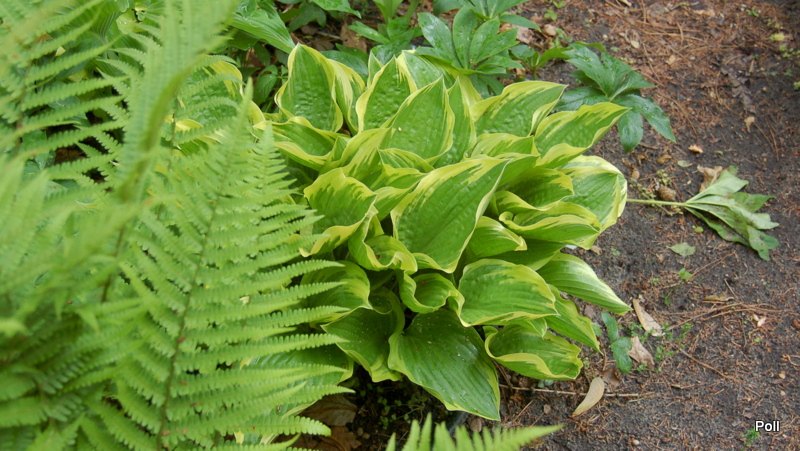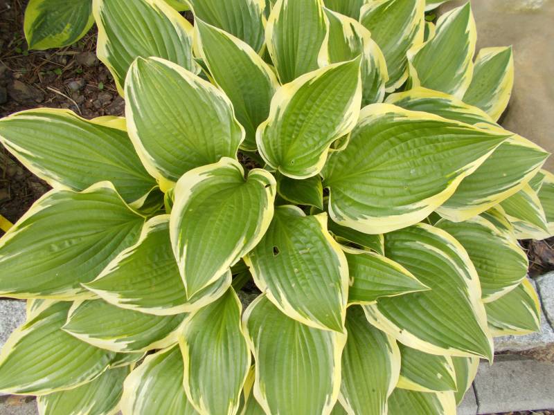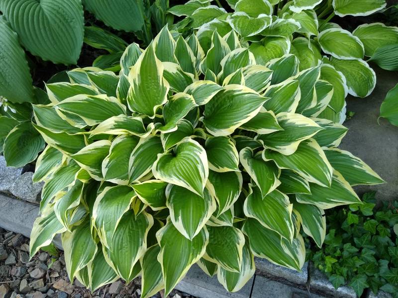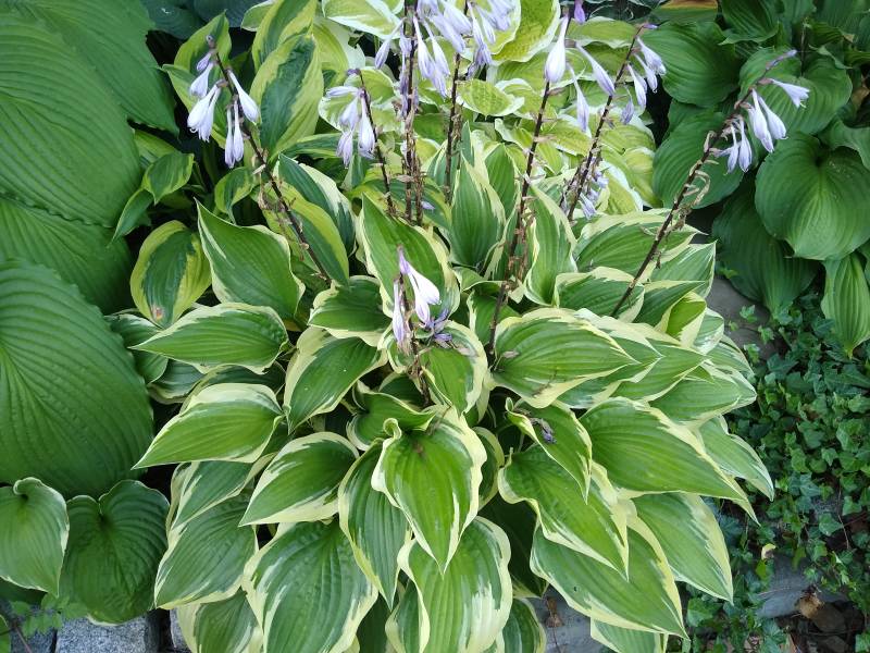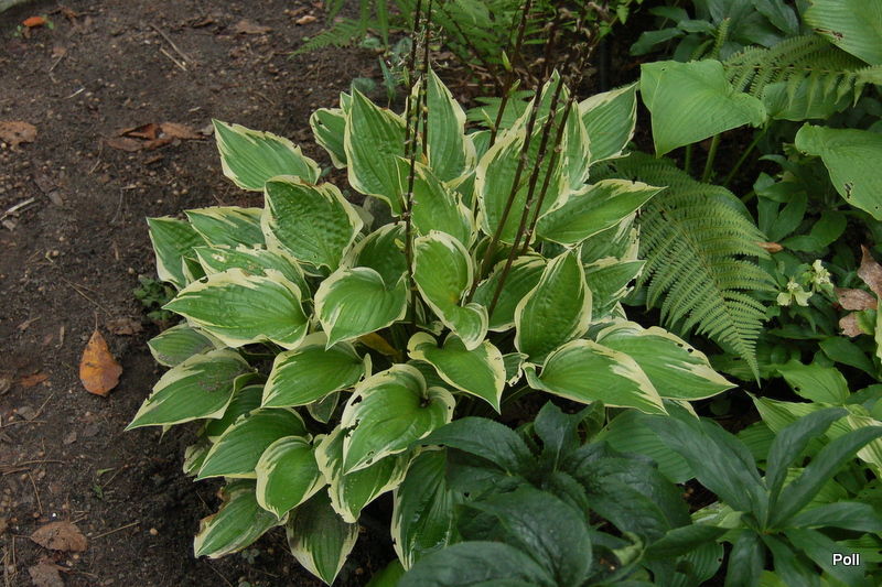 Rozmiar: M wysokość 35-45cm Liście: błyszczące, falujące, zielone z żółtawo kremowym marginesem Kwiaty: jasno fioletowe, kwitnie w sierpniu Zalecane stanowisko: półcień do cienia