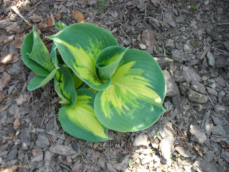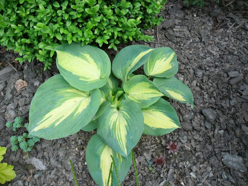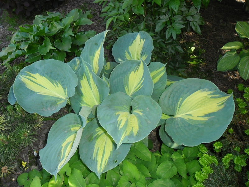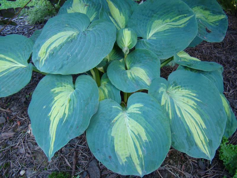 Liście: niemal okrągłe, ale ostro zakończone, niebiesko zielone z wąskim kremowym centrum; wiosną barwy sa bardziej nasycone - centrum jest żółtawe a margines niebieskoturkusowy