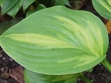 Liście: duże; okrągłe, lekko falujące i skręcone na czubkach; żółte centrum, zmieniające kolor z upływem czasu na kremowy, otoczone jest szerokim zielonym marginesem spływającym nieregularnie ku głównemu nerwowi
