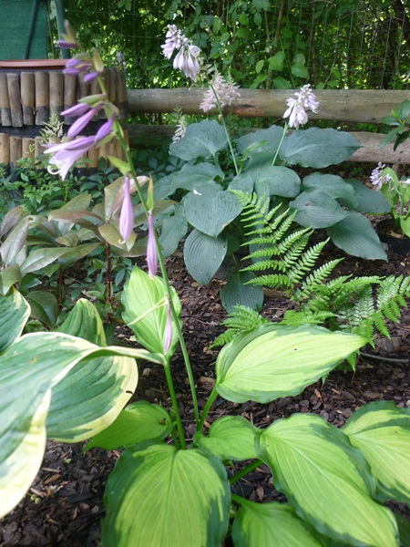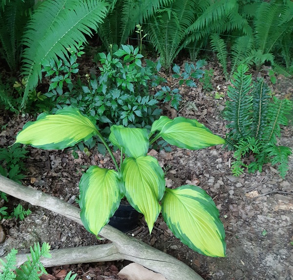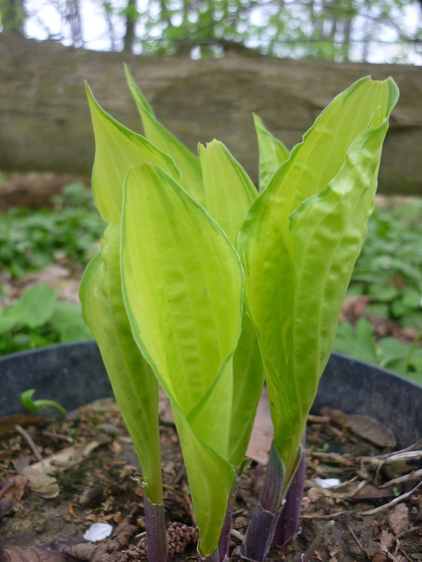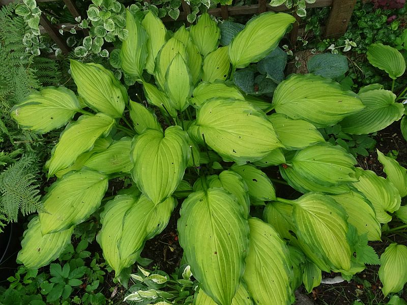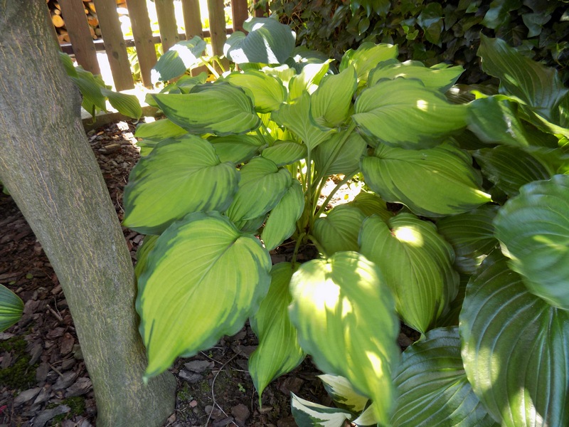 Hosta Lady Guinevere nie miała u mnie łatwego życia. Akurat w tym sezonie gdy ją dostałam (POlu ) miałam pierwszą inwazję ślimaków i wyjazd na dwa tygodnie. W kolejnym sezonie wyszła jednym kłem i cieszyłam się, że jest to zdrowy kieł, bo mam złe doświadczenia po ślimakowej konsumpcji. W tym sezonie jeszcze mała objętościowo, ale już zaczyna pięknie wyglądać.