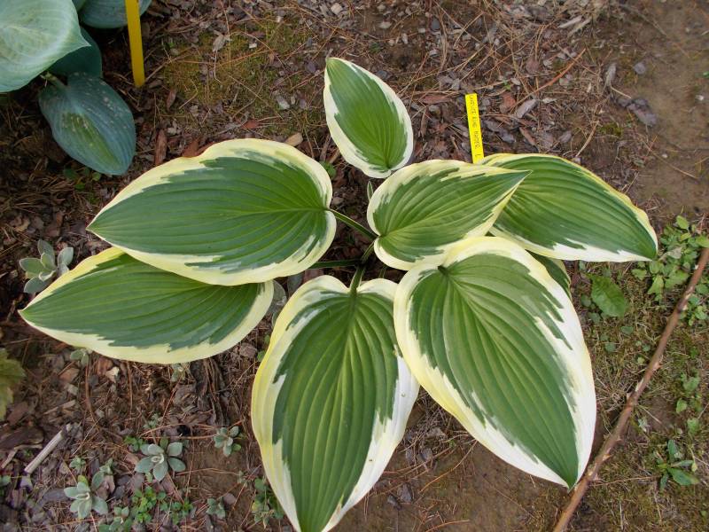Rozmiar: L wysokość 60-65cm Liście: zielone centrum z niebieskimi naciekami, margines dość szeroki przechodzący od żółtego do biali, lekko pofalowany Kwiaty: lawendowe, kwitna w lipcu i sierpniu Zalecane stanowisko: półcień do cienia