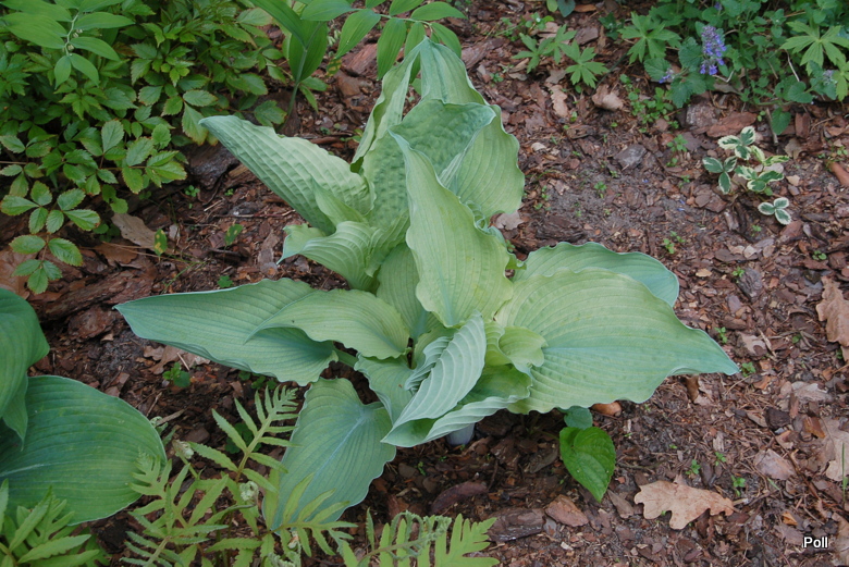 Rozmiar: L (wysokość około 60 cm, szerokość około 90 cm) Liście: podłużno-sercowate z mocno falującym brzegiem, o rozmiarach 40 x 20 cm ; wiosną szaro-białe, w trakcie sezonu zmieniają barwę na niebieskozieloną Kwiaty: niemal białe Zalecane stanowisko: półcień