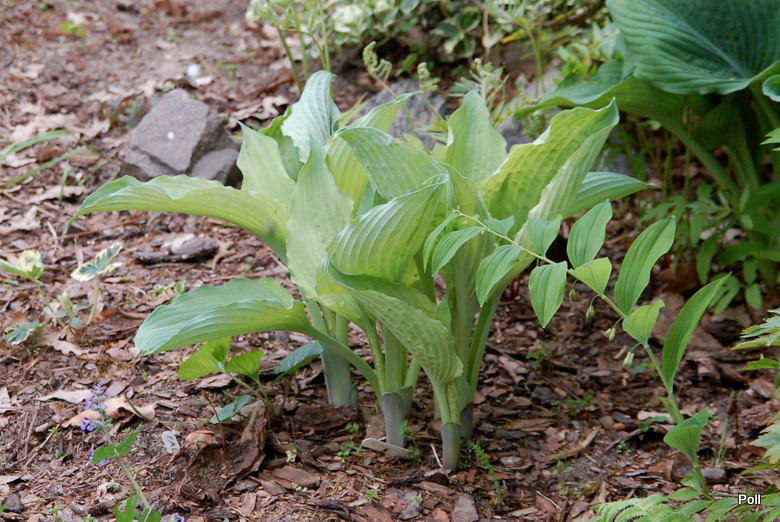 Nareszcie, w szóstym roku uprawy, fallen Angel zaczyna przypominać hostę. Cała roslina jest sporo wyższa, liście sa wiele większe, ładnie wzniesione i pofalowane