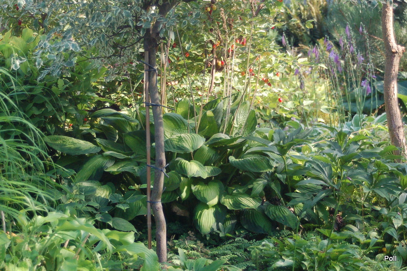 ... I taka dość mało kontrastowa, Margie's Angel pozostanie do końca sezonu. Rosnący nad nią dereń jadalny 'Tricolor' rozrósł i daje sporo cienia. Z drugiej strony ocienią ją dereń skrętolistny 'Argentea'.