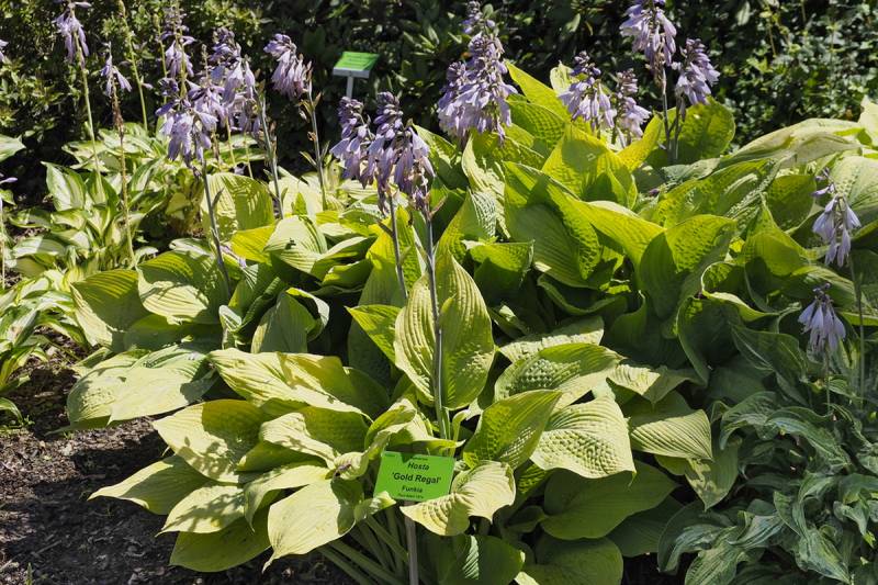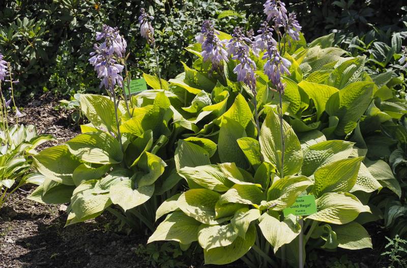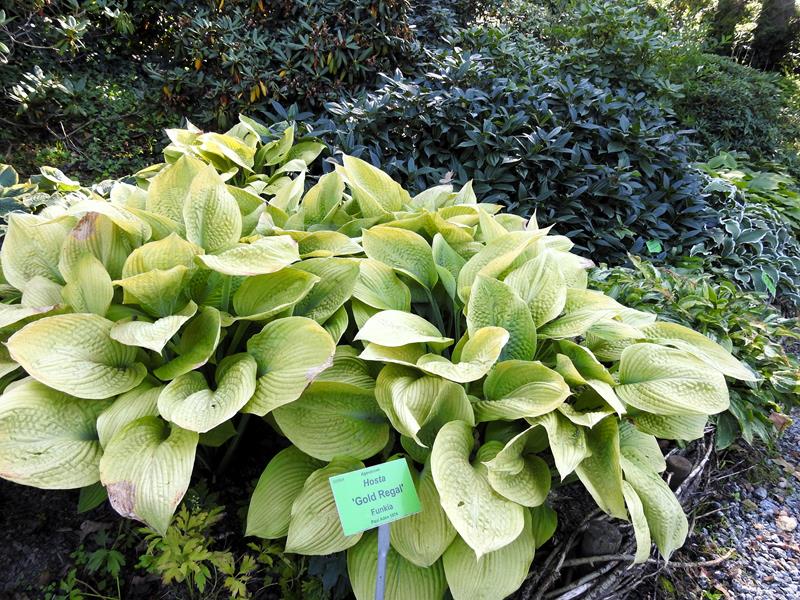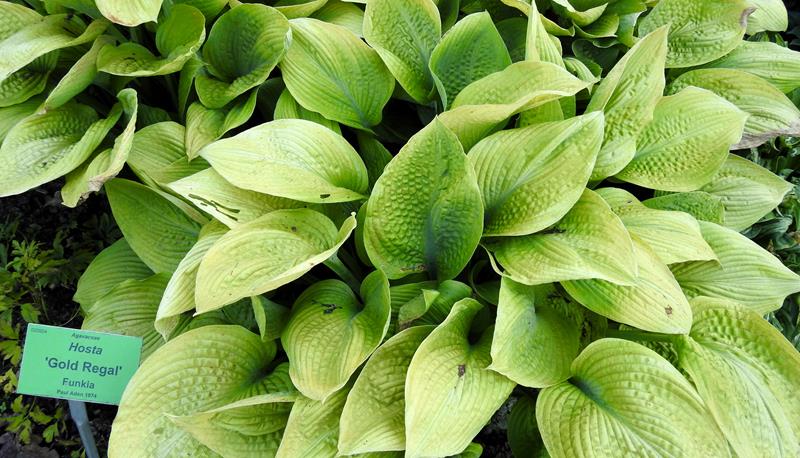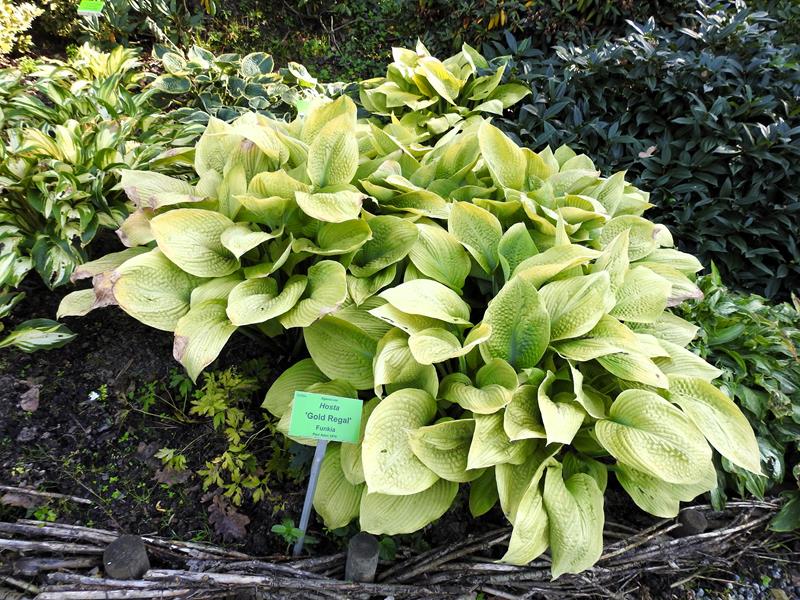 Liście: żółto złote, złote, wybarwiają się nierównomiernie, ze smugami, sztywne, lekko pokarbowane, spód pokryty sinym nalotem
