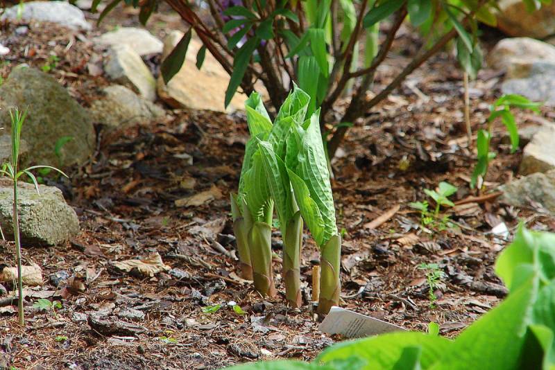 Hosta Smokey Bear dopiero rozwija liście z kłów. U mnie w ogrodzie rozpoczyna czwarty sezon i do tej pory trzy razy zmieniała miejsce. Obecnie rosnie razem z innymi hostami Olgi Petryszyn, na pólcienistym, często podlewanym stoku.