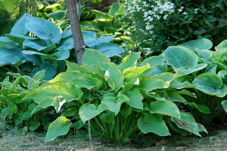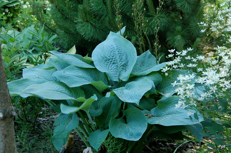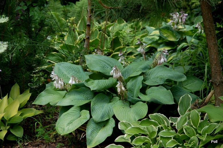Rozmiar: G 85-90 cm wysokości Liście: duże rozmiarowo, mocnej substancji; niebieskoszare ( w trakcie sezonu szarozielone) z dobrze widocznymi nerwami, lekko falujące Kwiaty: prawie białe, kwitnie czerwiec/lipiec Zalecane stanowisko: półcień do cienia