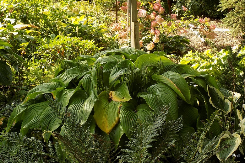 Rozmiar: XL wysokość 100-120cm Liście: zielone, w kształcie serca, Kwiaty: prawie białe, kwitnie czerwiec/lipiec Zalecane stanowisko: półcień do cienia