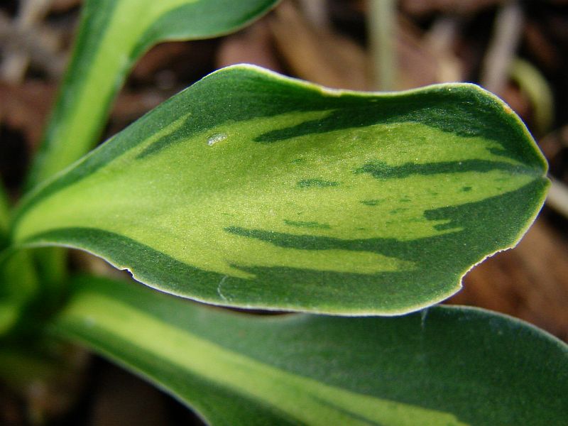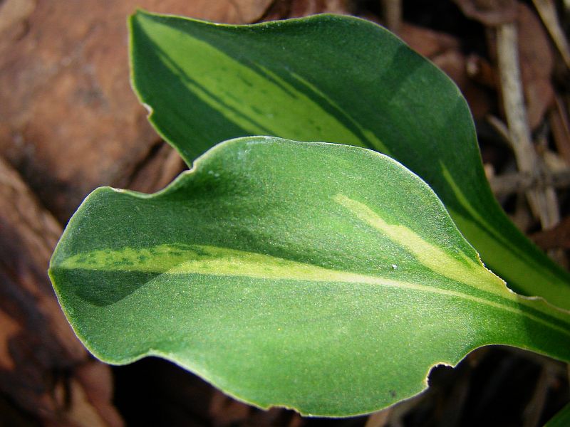Liście: podłużne, twarde... jasnozielone centrum z ciemnozielonym marginesem, wzajemnie na siebie nachodzące nieregularnymi smugami