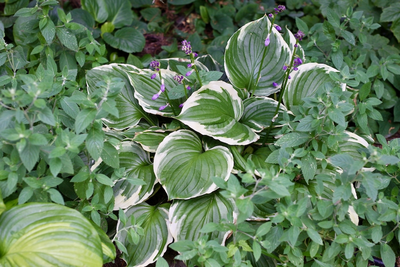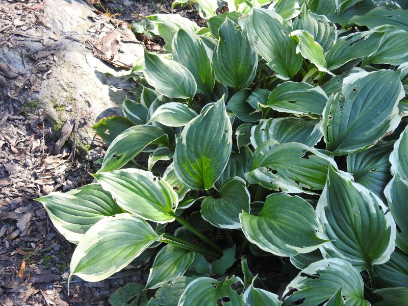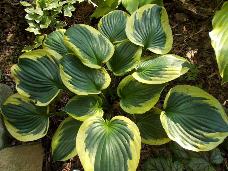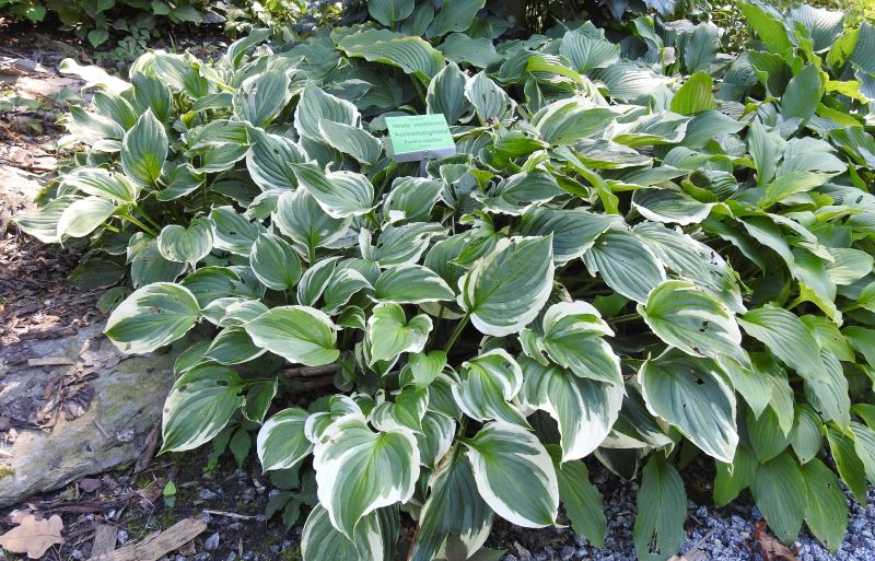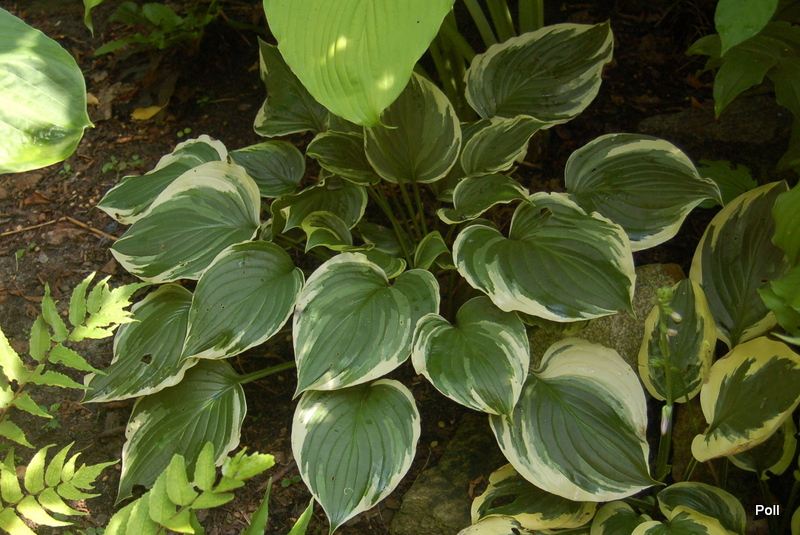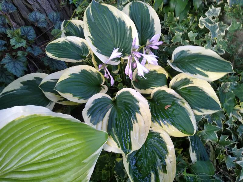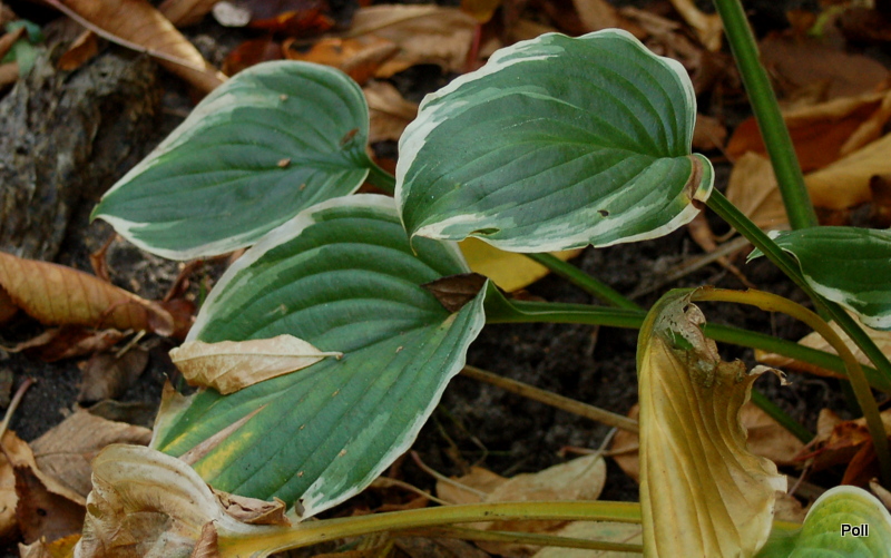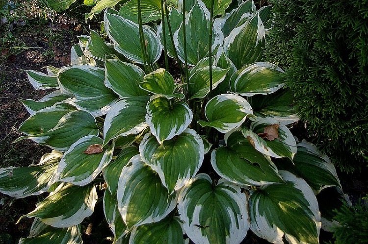 Liście: sercowate, lśniące , dość miękkie; ciemnozielone centrum otoczone żółtawym, bielejącym w trakcie sezonu , nieregularnym marginesem