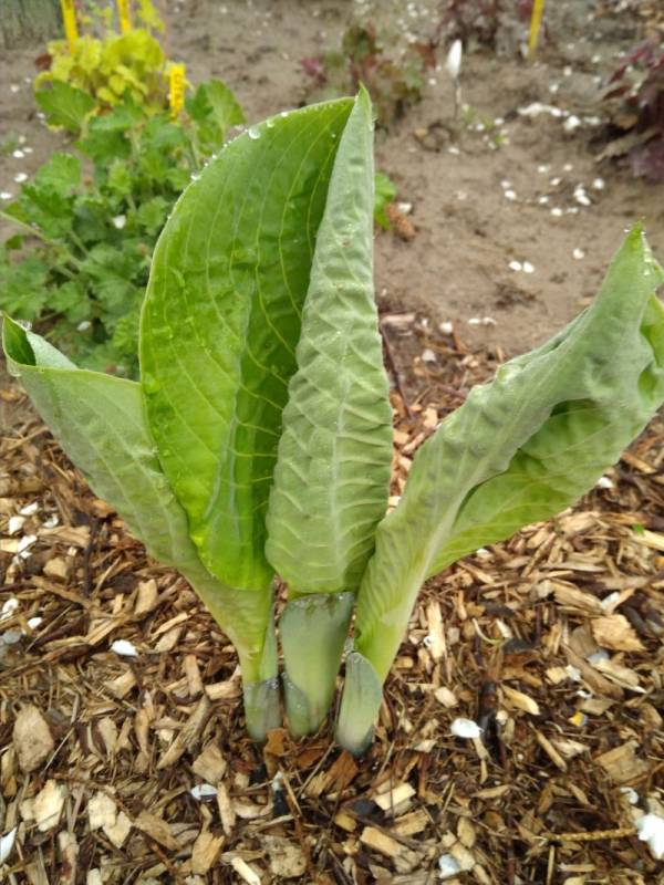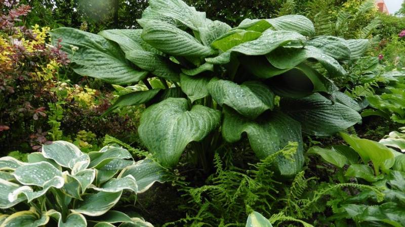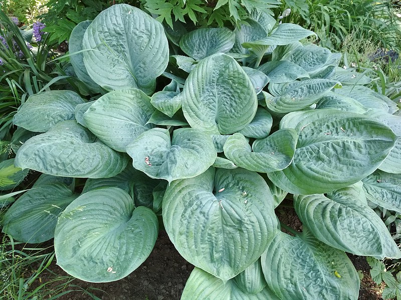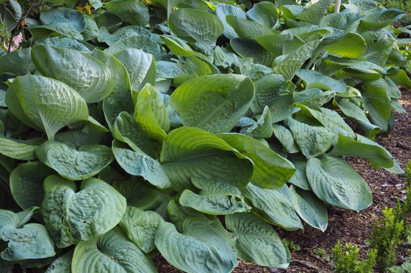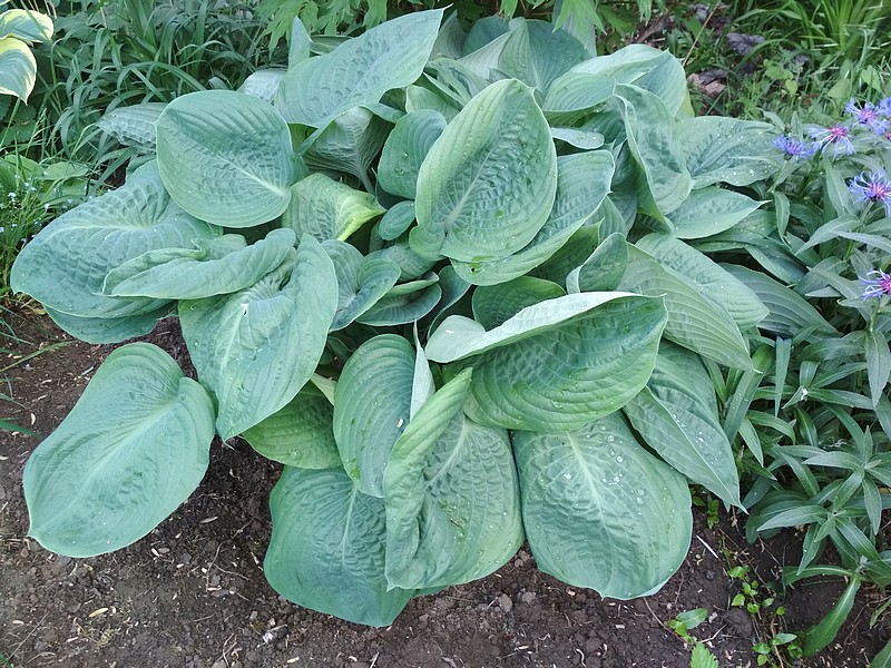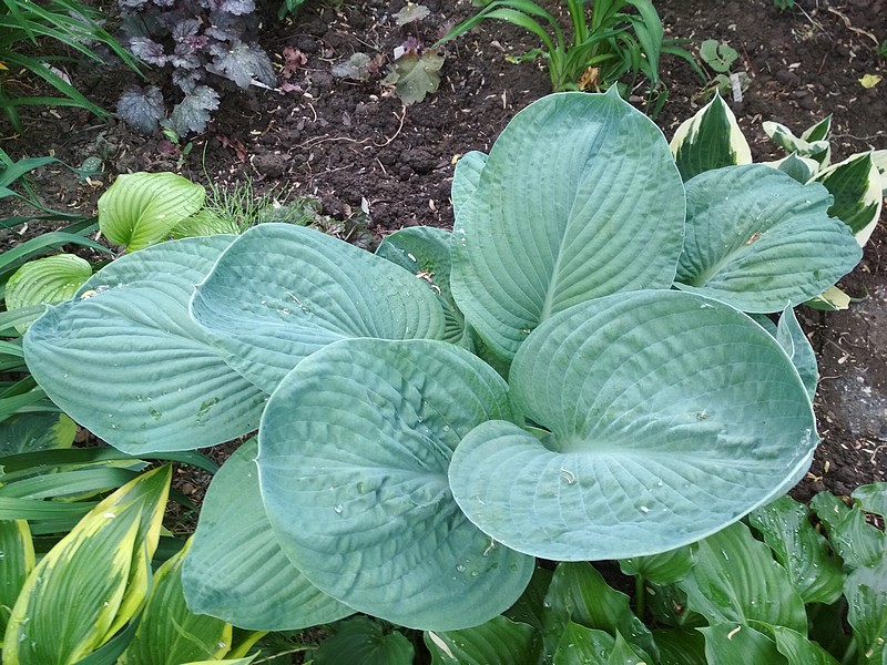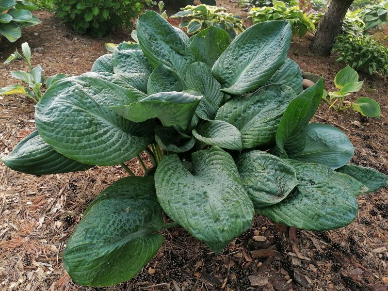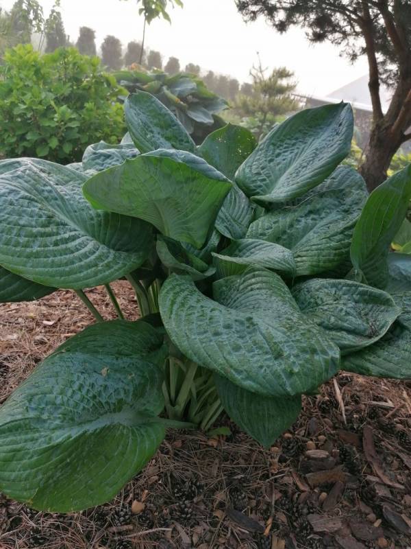 Hosta Blue Umbrellas po starciu wiosennego, matowego pudru, staje sie ciemna i błyszczaca