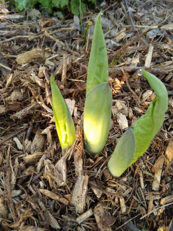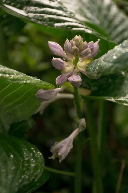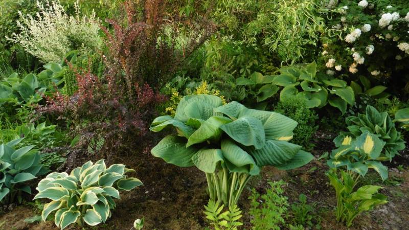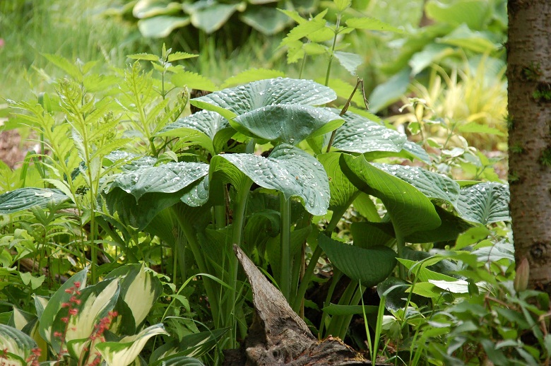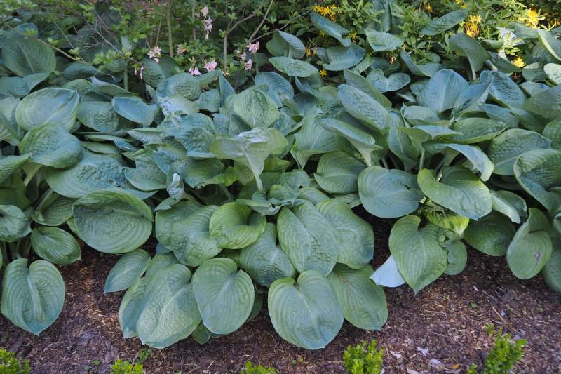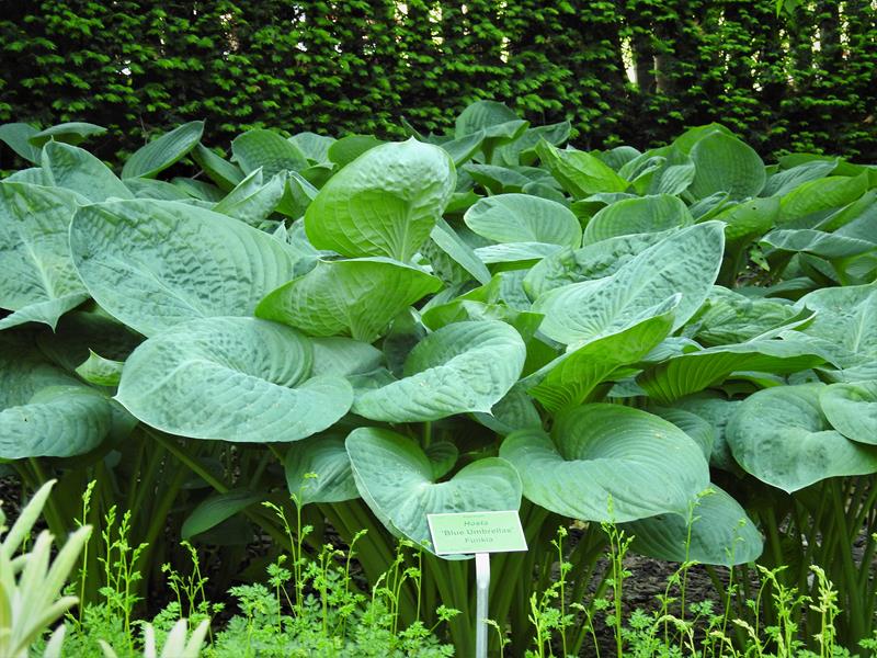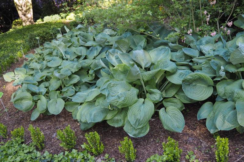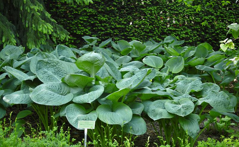 Hosta Blue Umbrellas po starciu wiosennego, matowego pudru, staje sie ciemna i błyszczaca