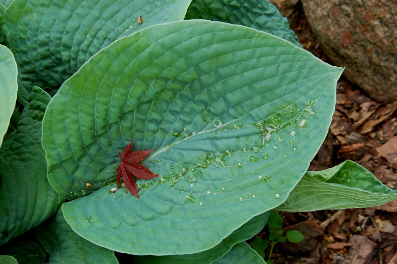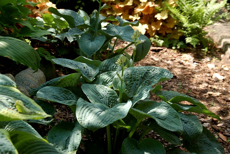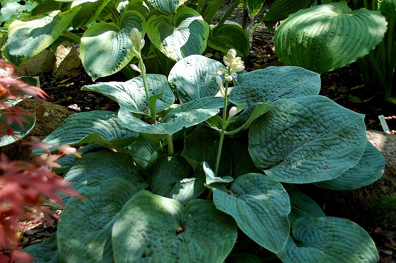 Z pąkami kwiatowymi osadzonymi na ulistnionych łodygach ( za nią, w tle hosta Will of Fortune)