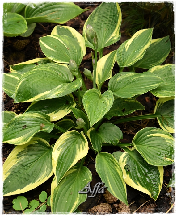 Fotki z lipca. Utrzymała przez sezon 5 kłów, z którymi wystartowała wiosną, nie przybył żaden dodatkowy. 1 z jasnym marginesem, 4 streaked. Każda rozeta wypuściła kwiat, ale pomimo zapylania różnymi hostami, kwitnącymi w tym samym czasie nasienników nie ma.