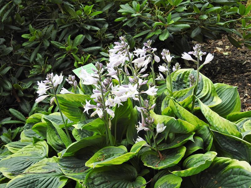 Rozmiar M wysokość 50-55cm Liście: okragło-sercowate ;ciemnozielone centrum otoczone szerokim,nieregularnym marginesem w kilku odcieniach :wiosną są to odcienie zieleni, w późniejszym czasie żółci , kremu i bieli Kwiaty: lawendowe (VII/VII) Zalecane stanowisko: od półcienia