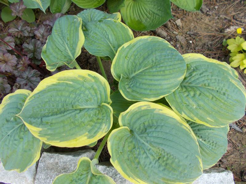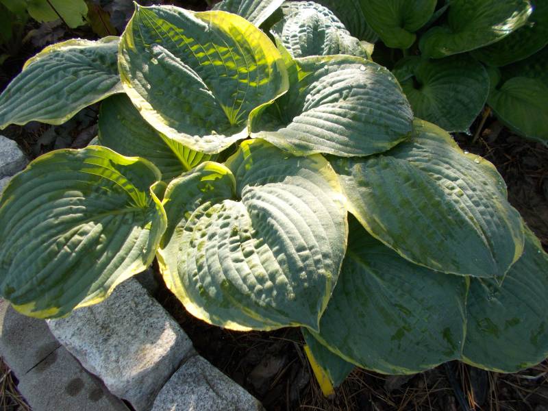 Liście: okrągło-sercowate, duże, ciężkie o dobrej substancji; wiosną pokryte niebieskim nalotem, w sezonie stają się lśniące, ciemne - zielononiebieskie, otoczone kremowym, falującym marginesem; u starszych osobników widoczne są lekkie burchle