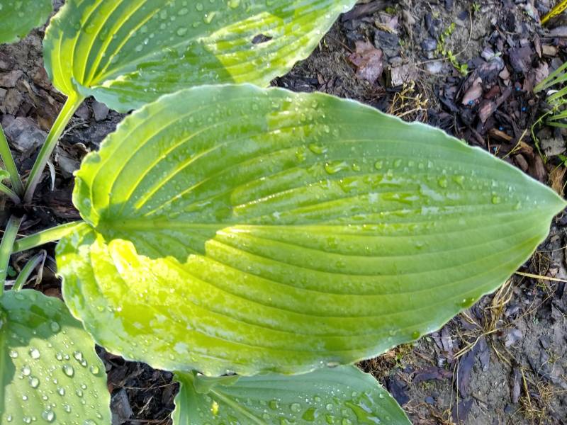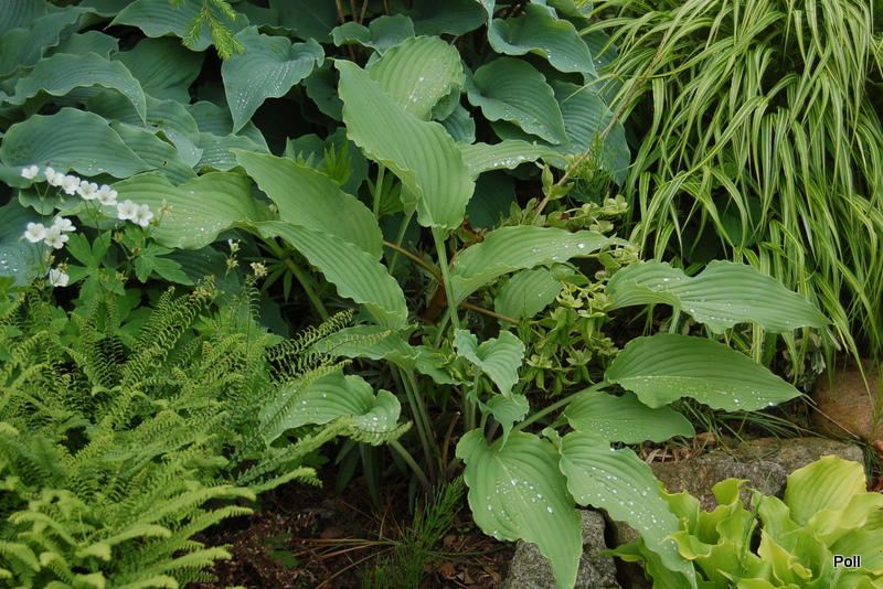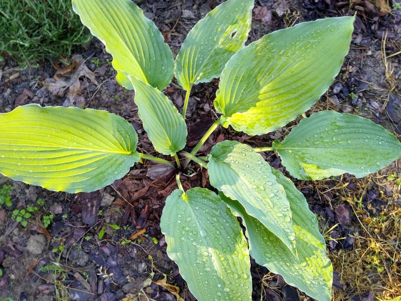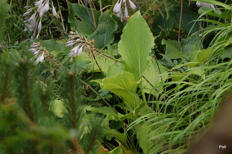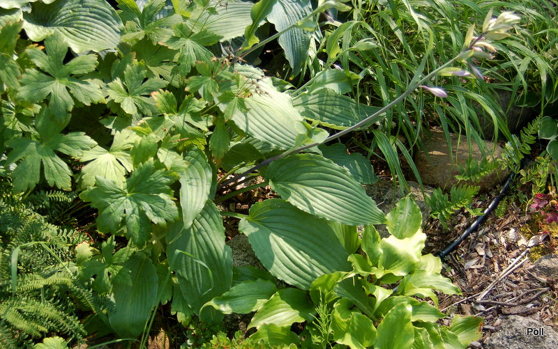 Po przemarznięciu w ubiegłym roku, kępa Love Song - jak u kilku innych host - sama się podzieliła na kilka części. Środkowa część zanikła i kły są oddalone od siebie o kilka centymetrów. Ogólnie kępa jest mniejsza a cała roślina niższa. Szkoda, bo to jedna z falbaniastych odmian, które bardzo lubię.