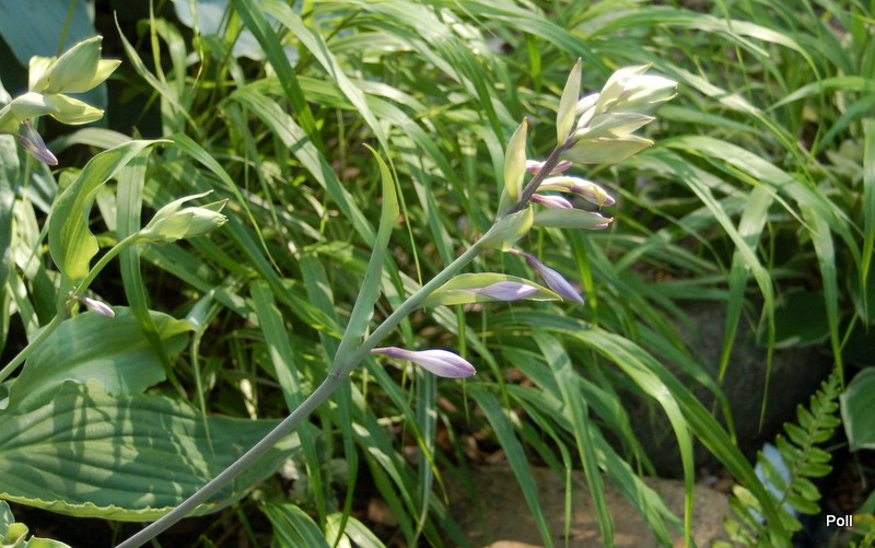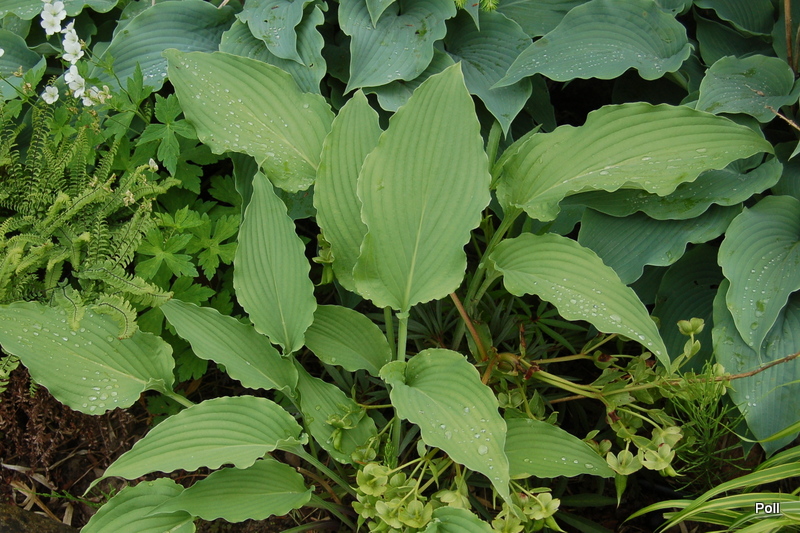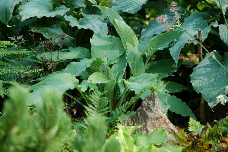 Rozmiar: L wysokość 55cm Liście: zielono-szare, wydłużone, z mocno falowanym brzegiem, wydatnym żyłkowaniem i białawym tyłem liścia; początkowa część łodyżek liściowych czerwona. Kwiaty: jasnolawendowe, kwitnie od połowy lipca Zalecane stanowisko: półcień, cień