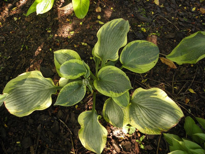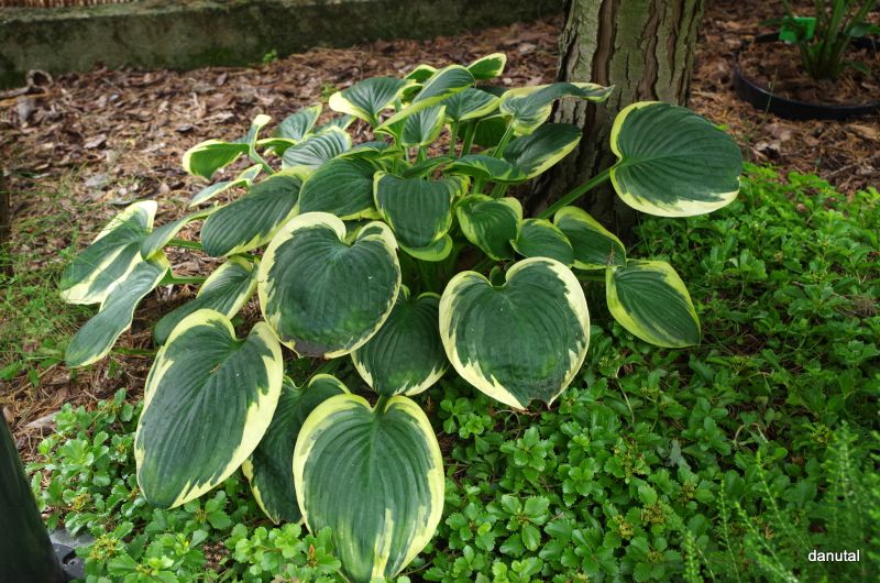 Rozmiar: L wys.60-70cm; szer.ok.100cm Liście: talerzowate, niebiesko-zielone z żółtym marginesem Kwiaty: lawendowe Zalecane stanowisko: półcień do cienia