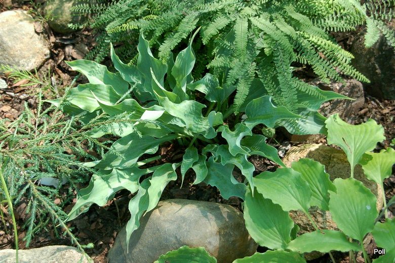 Rozmiar M. (40 cm wysokosci i do 90 cm szerokosci) Liscie: wiosna maja pudrowoniebieskie zabarwienie, w lecie staja sie niebieskozielone. Brzegi lisci podnosza sie ukazujac biala spodnia strone lsicia. Kwiaty: jasnolawendowe na polmetrowych pedach, w polowie lata.