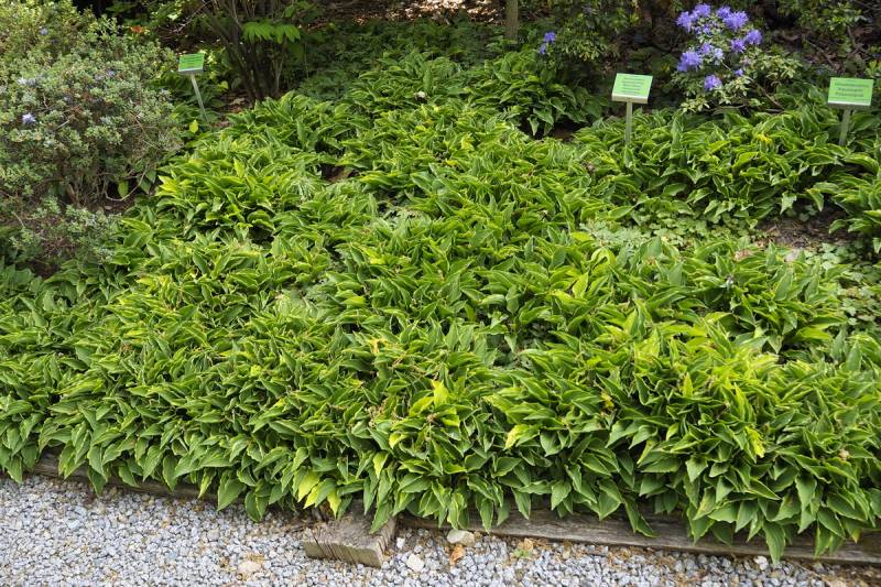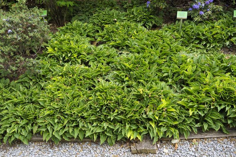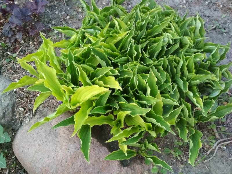 Rozmiar: S wysokość 15-20cm Liście: wąskie,ciemno zielone z żółtym falistym marginesem Kwiaty: purpurowe (fioletowe) w czerwcu - lipcu na 45-50 cm łodygach Zalecane stanowisko: wg Fransena od słońca do cienia
