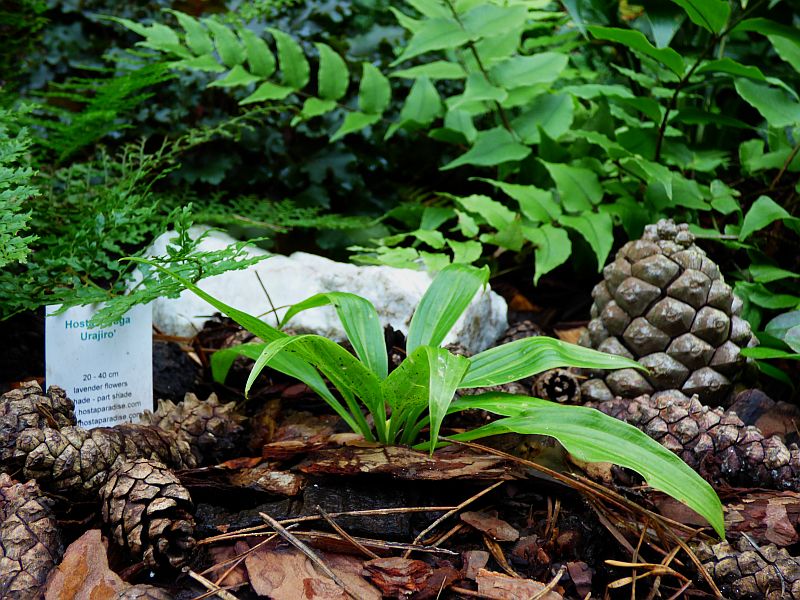 Moja Hyuga Urajiro to też kompletna porażka :mur. Kupiona jesienią 2015 roku w ramach jednych z pierwszych świadomych hostowych zakupów. Chyba po 4 latach była już w zaniku, praktycznie bez korzeni. Włożyłam do wody to co zostało - pojedynczy pęd bez korzeni, co jej się najwyraźniej spodobało, bo wypuściła cały pęczek korzeni i przy okazji kilka kiełków. Było to jesienią. W następnym roku pokazała się ale maleńka, i w kolejnych latach niewiele przyrosła. W tym roku pasłam ją gnojówką z mniszka i z pokrzywy. Na razie wygląda nieco lepiej - dla właściwego zobrazowania jej obecnego rozmiaru obok jest etykieta z Sadzawki.