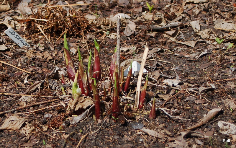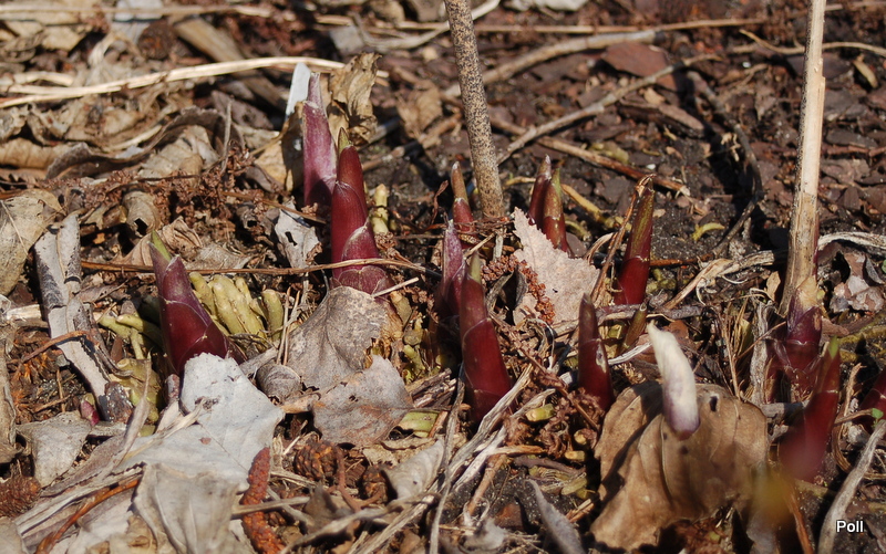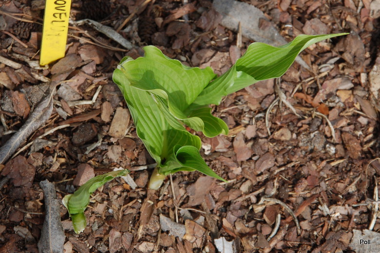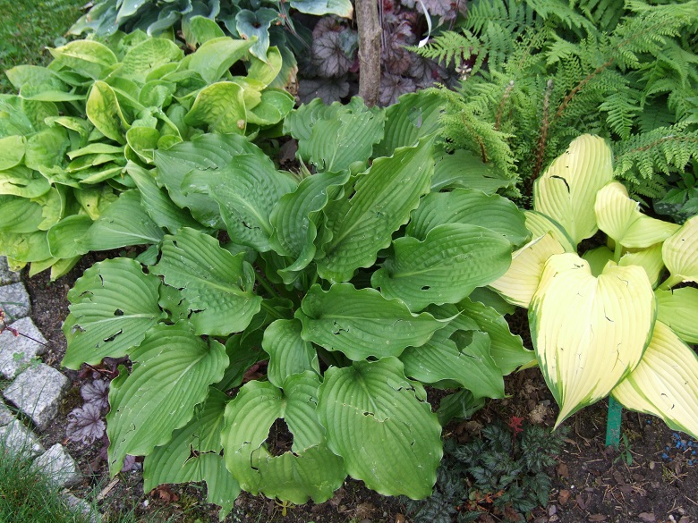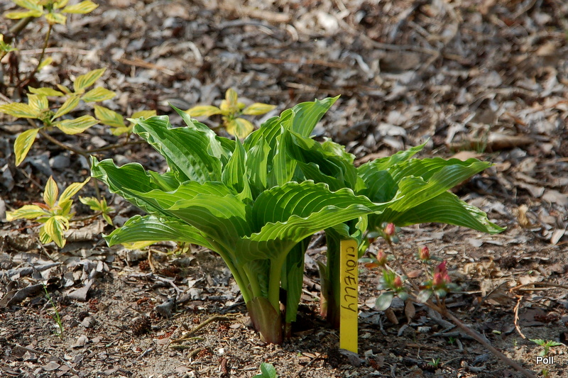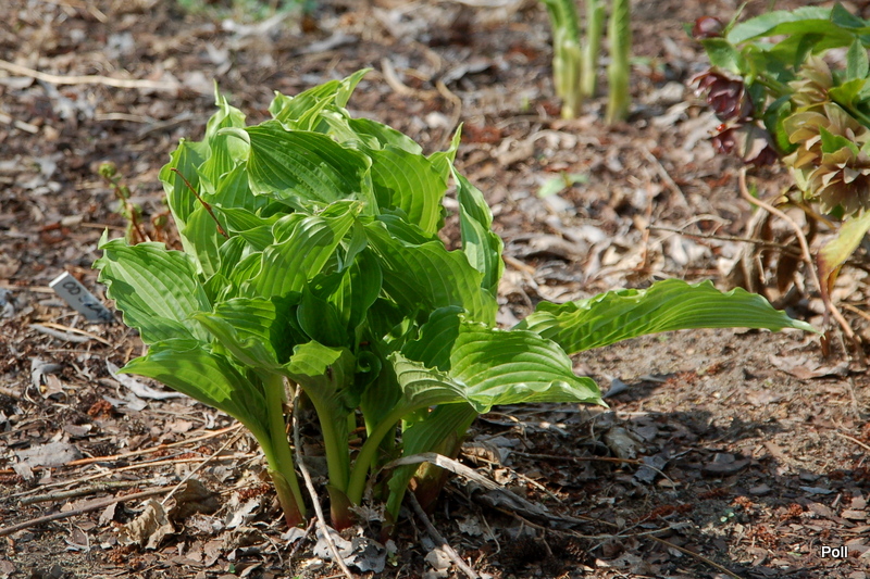 Clovelly, to jedna z host, które podzieliłam i przeniosłam na naturalnie wilgotne stanowisko. Niestety, wypadło mi z głowy, że ona stosunkowo wcześnie staruje i nie dałam jej miejsca w całorocznym cieniu. Obie kępy z podziału ucierpiały od przymrozków, ale jedna do tego stopnia, ze wycięłam jej wszystkie kły. Drugą - te ze zdjęcia - tylko obrałam z przemrożonych liści.
