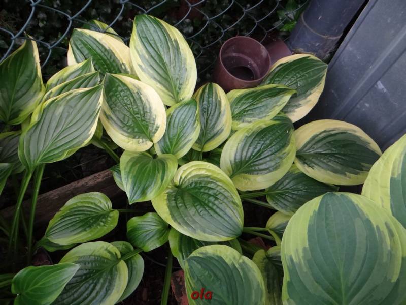 Liście: zaokrąglone, błyszczące, w starszym wieku również pofałdowane... ciemnozielone z szerokim, żółtym, następnie kremowobiałym marginesem