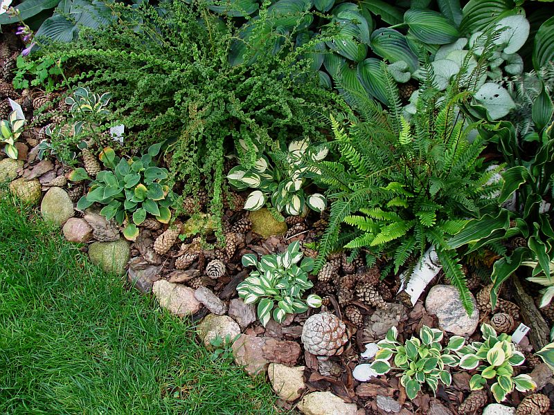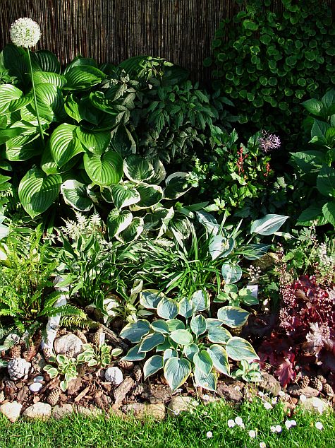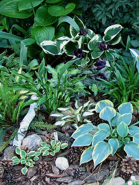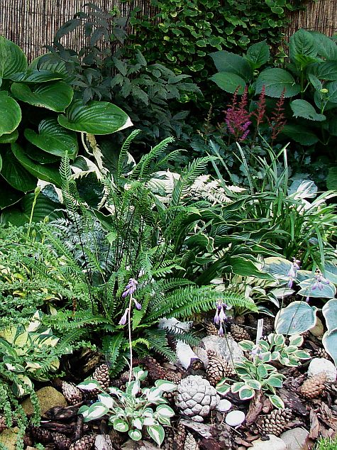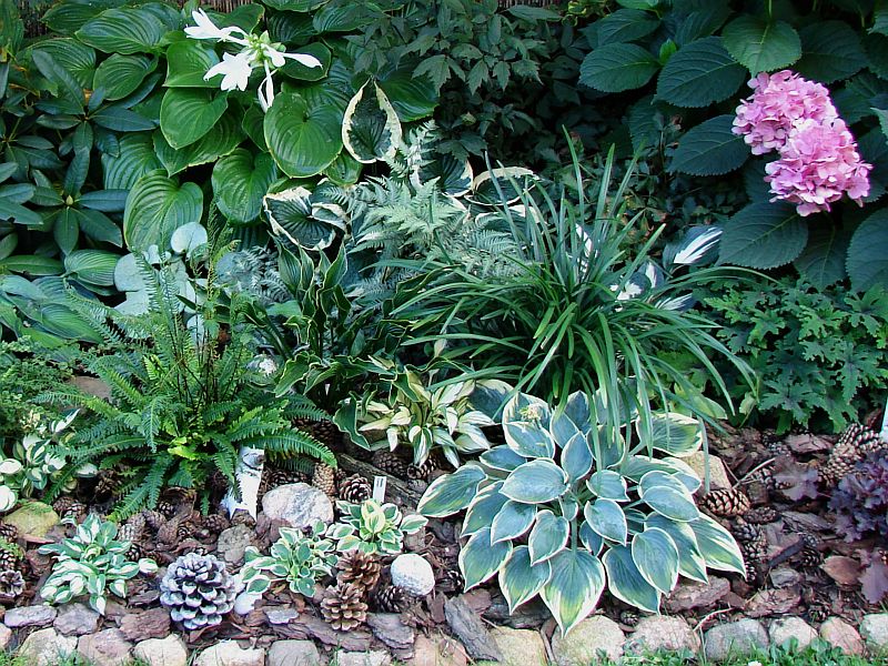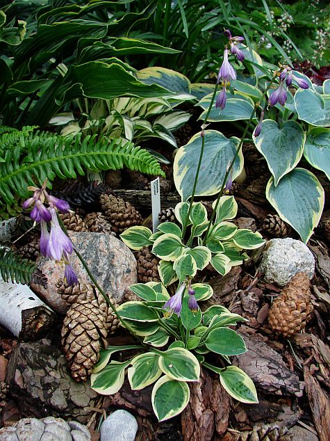 oraz zdjęcie rodzinne... po lewej mamusia zielonolistna 'Baby Bunting'... następnie siostry... między paprotami 'Cherish' a poniżej 'Pandora's Box'