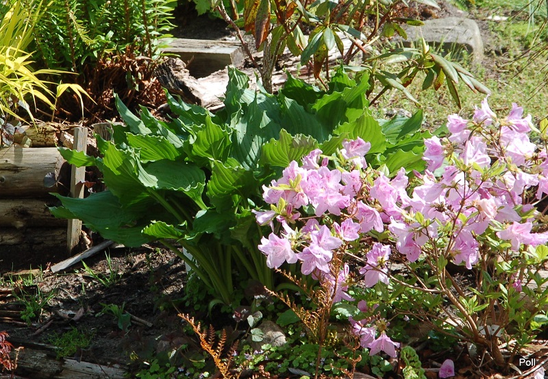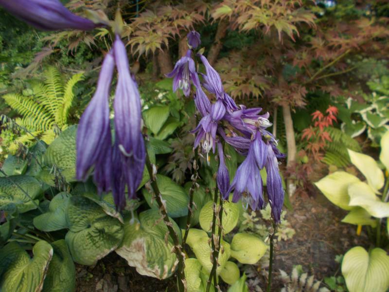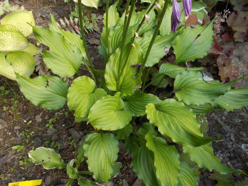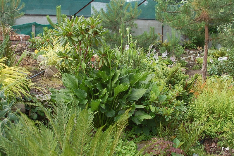 Hosta Stirfry - kupiona ponownie w 2017 roku, (wiosną) sadzonka z in vitro. poprzedni egzemplarz złapał chróbsko, które wyglądało na mozaike, więc szybko poszła w ogień. Posadziłam ja w dość ciemnym miejscu, u stóp mocno podlewanego rododendrona, na paprocianym stoku.
