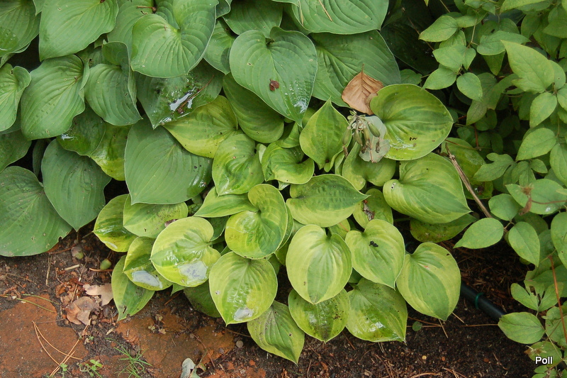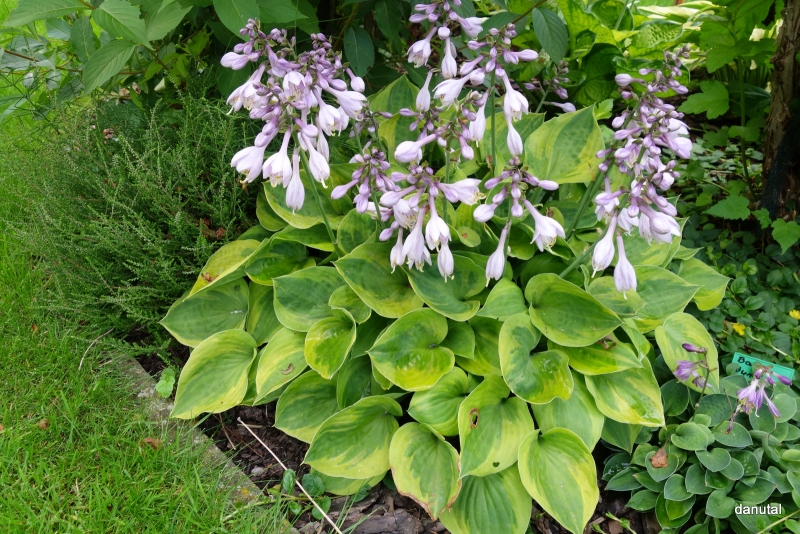 Rozmiar: S/M wysokość 25-30cm. Liście: grube,sercowate z zielonym centrum i żółtym, nieregularnym marginesem Kwiaty:lawendowe na wysokich 60 cm łodygach /VI-VII/ Zalecane stanowisko: od słonecznego do cienistego Uwagi: