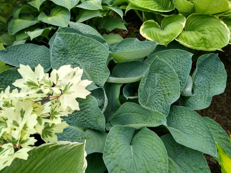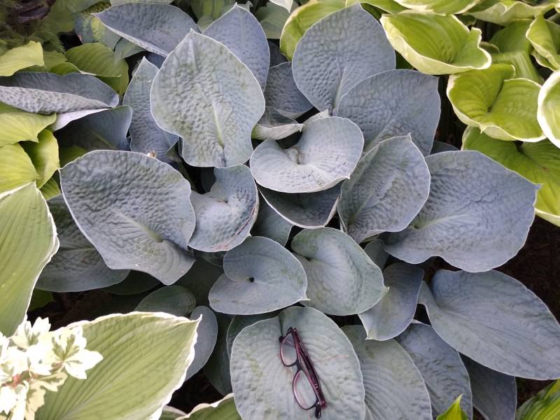 Wielkość L wysokość do 70 cm Liście - wiosną niebieskie , później zielone z szarym nalotem , pomarszczone , grube w kształcie serca Kwiaty -nisko osadzone nad liśćmi , prawie białe Wzrost - średni Zalecane stanowisko - cień , półcień