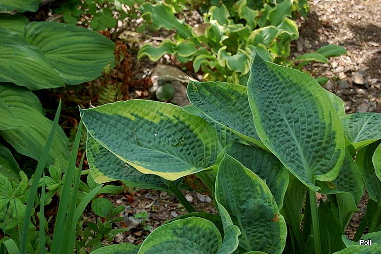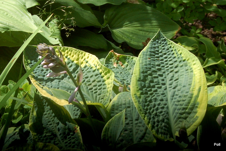 Liście: duże, okragło-sercowate, grube, wyraźnie burchlaste; wiosną niebieskie z zielonkawym marginesem, w trakcie sezonu zmieniają barwę na ciemną-stają się niebieskozielone a margines jaśnieje i staje się jaskrawo złocisty