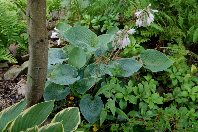 Rozmiar: ML ( około 50-60 cm wysokości) Liście: sercowate, o lekko miseczkowatym kształcie, burchlaste w kolorze niebieskiego, spranego dżinsu Kwiaty: białe, kwitnie w lipcu