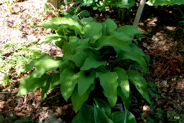 Rozmiar M (wysokość około 35 do 40 cm) Liście: podłużne, dobrej substancji, falujące,lśniące; zmieniające się w trakcie sezonu z zielonych w zielonożółte z zielonkawym, marginesem; osadzone na bardzo długich, ciemnobordowych ogonkach; na backu dobrze widoczne unerwienie Kwiaty: lawendowe w lipcu Zalecane stanowisko: od 25 do 75% cienia ( intensywniej wybarwia się przy większej ilości słońca)