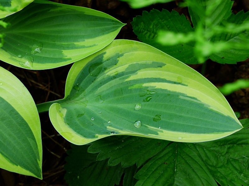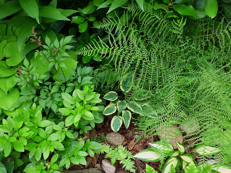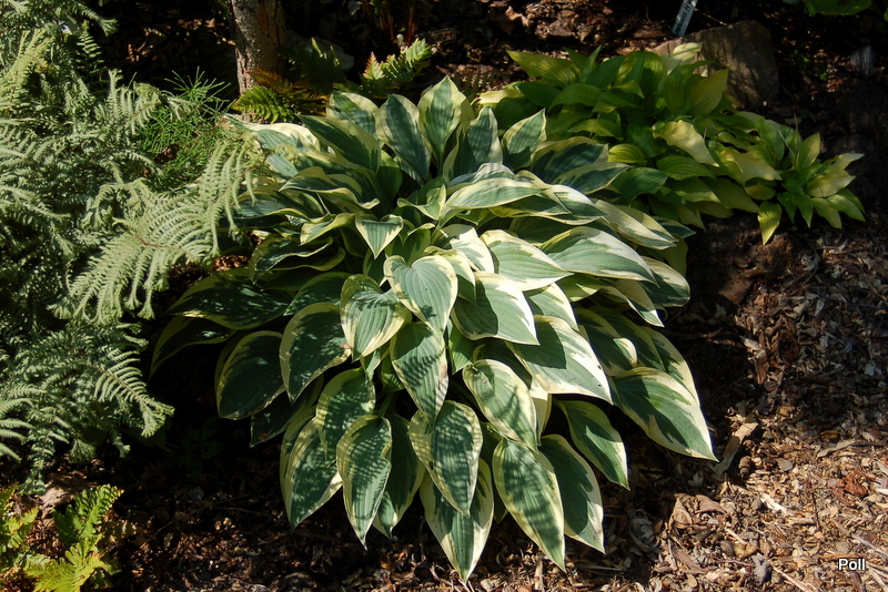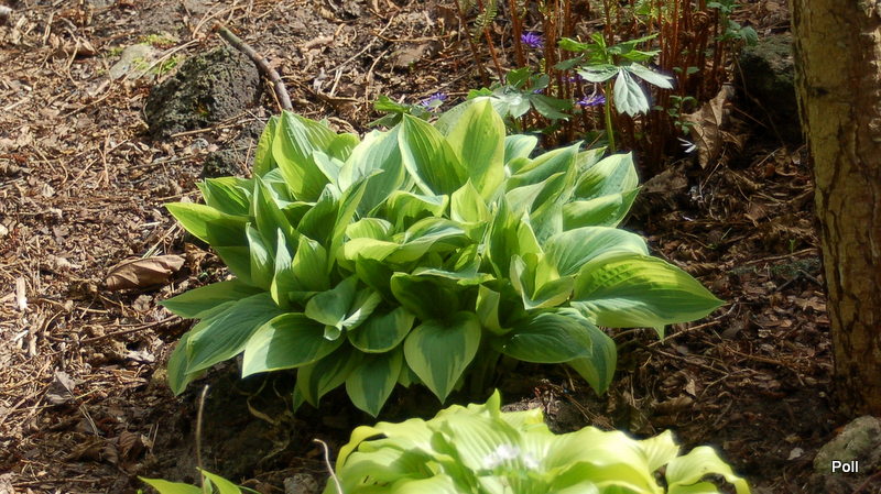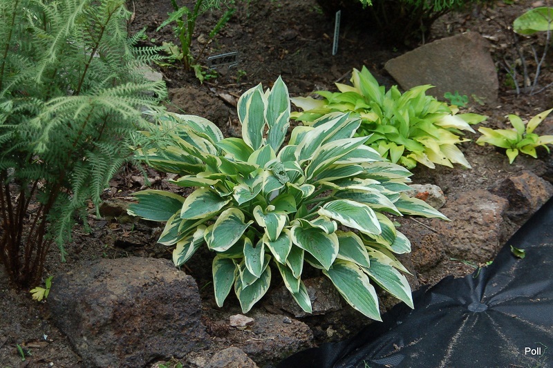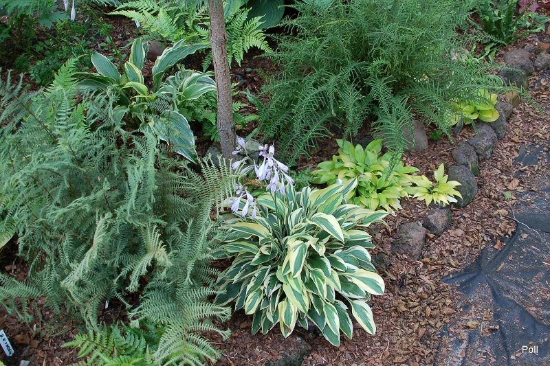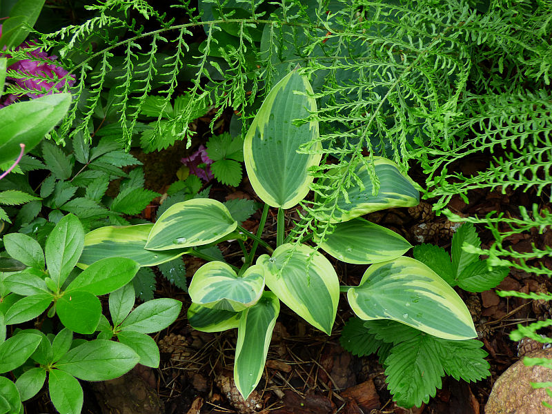 Nad nią hosta 'Atlantis', a na paprapecie 'Curly Fries'
