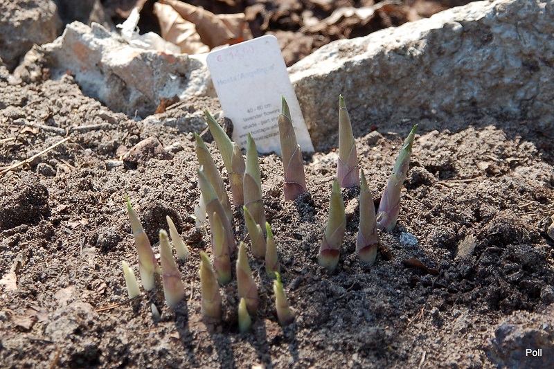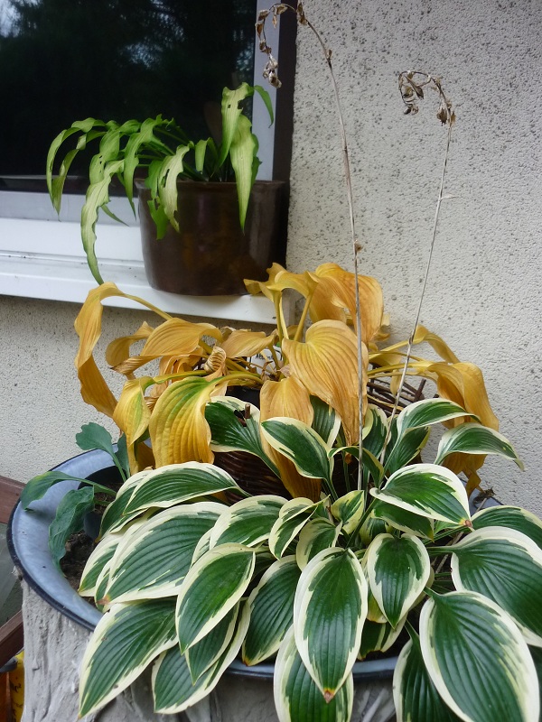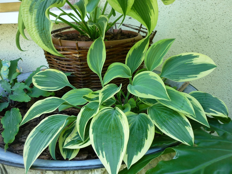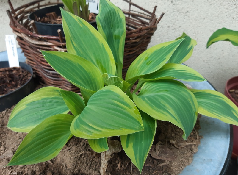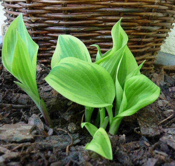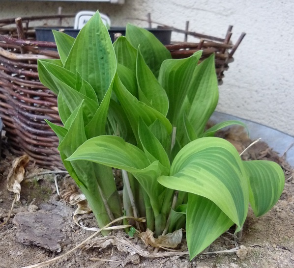 Hosta 'Angelique' jako pierwsza rozwinęła skrzydła. Nic dziwnego, rośnie cały czas w beczce pod domem. Ma tutaj jasny cień i dość ciepło. Mogła by mieć tylko nieco spokojniej, ale moja kotka upatrzyła sobie tę beczkę do wędrówek.