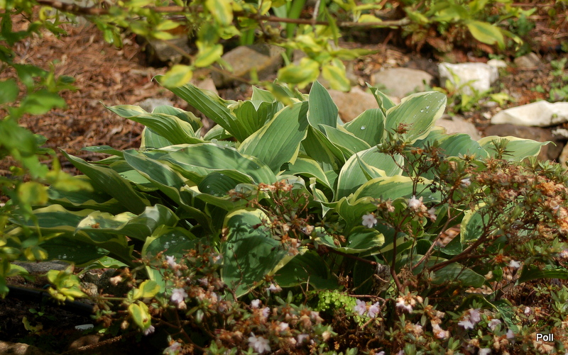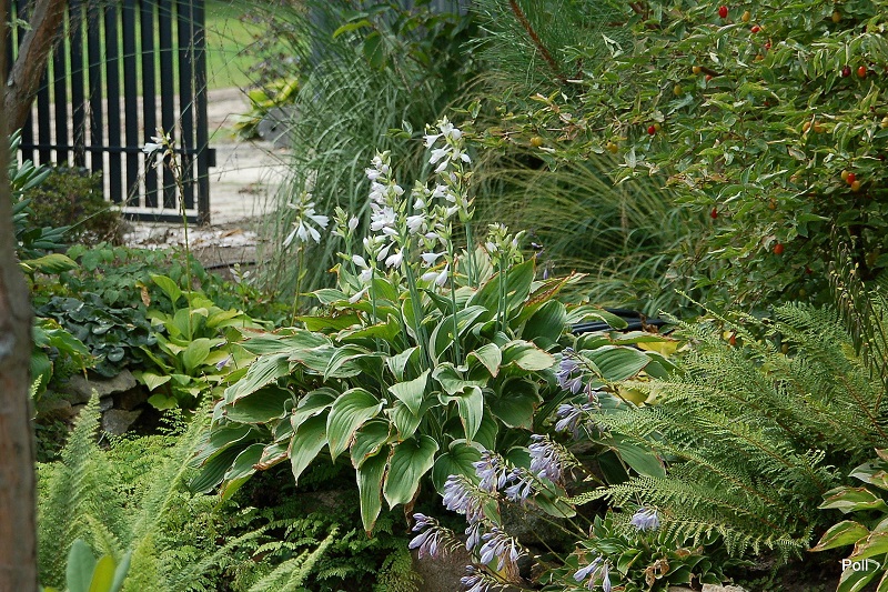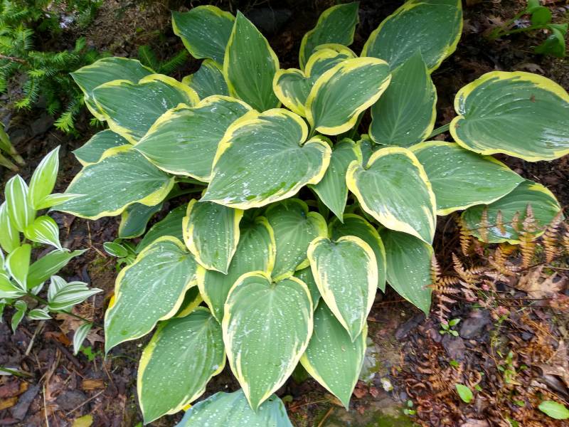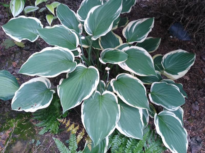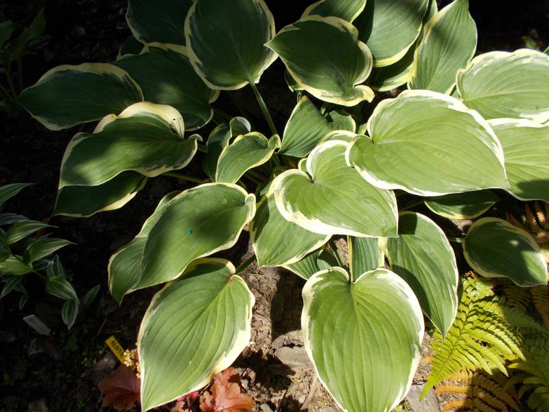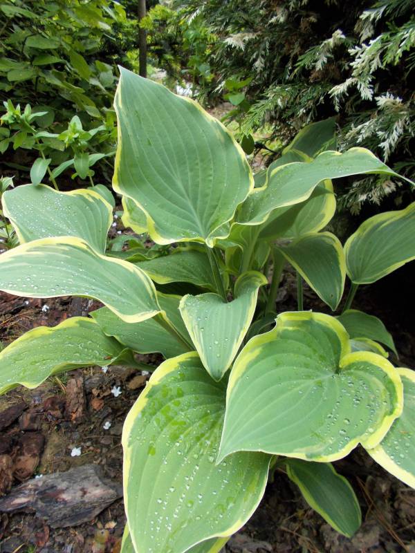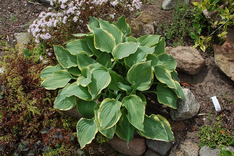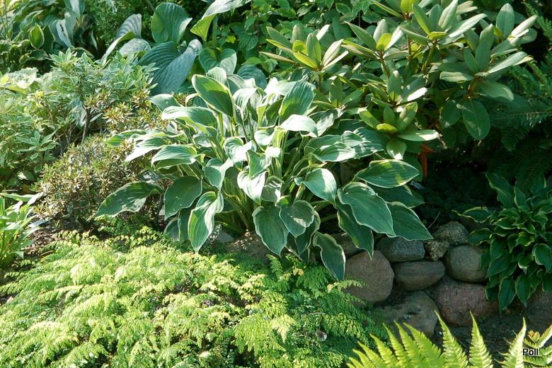 Rozmiar: M wysokość od 35 do 45 cm, szerokość 80-90 cm Liście: szaro-zielone liście o kremowo-białej krawędzi, 18x13 cm Kwiaty: jasno lawendowe, kwitnie od połowy czerwca do połowy lipca Zalecane stanowisko: półcień do cienia Uwagi: