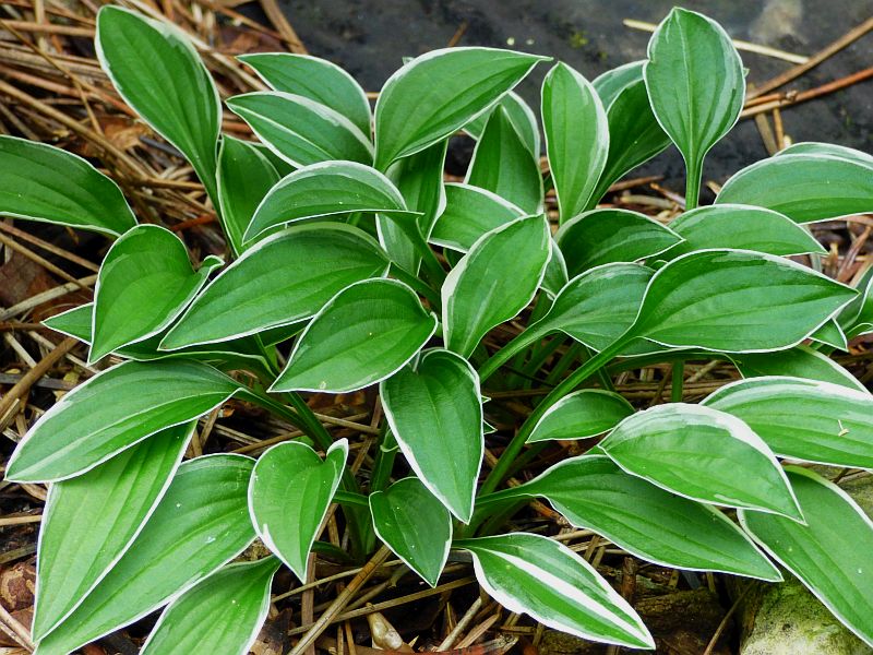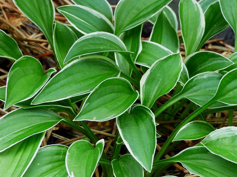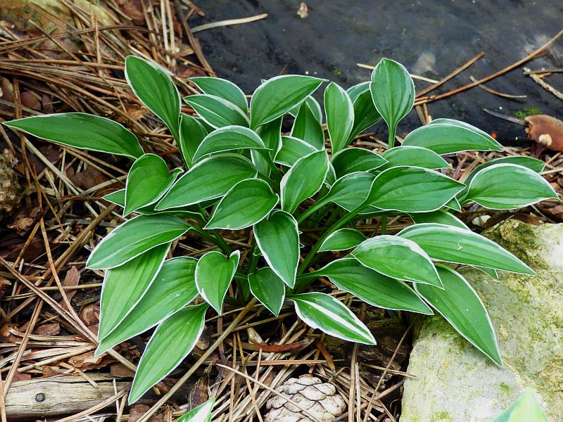 Liście: wąskie, o wymiarach 10 x 3 cm, ciemnozielone z falistym, białym marginesem
