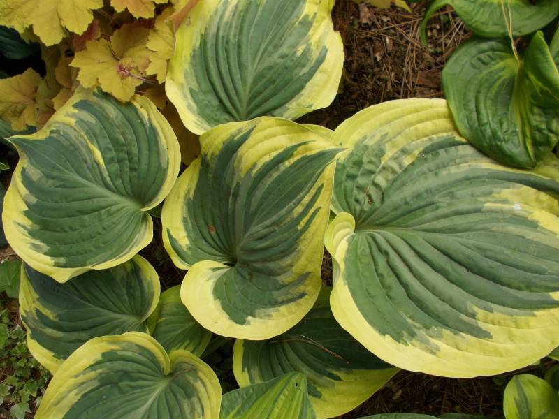 Liście: sercowatego kształtu, o dobrej substancji i mocno odznaczających sie nerwachi, z połyskiem; zielone centrum otoczone jest bardzo szerokim, nieregularnym, kremowym marginesem - wiosną margines jest żółty