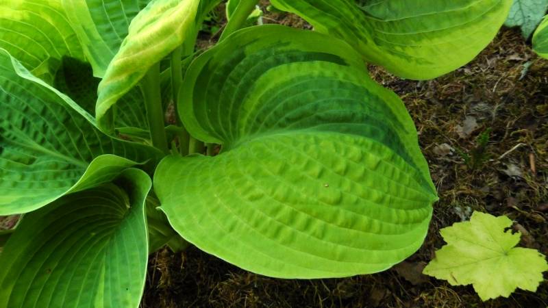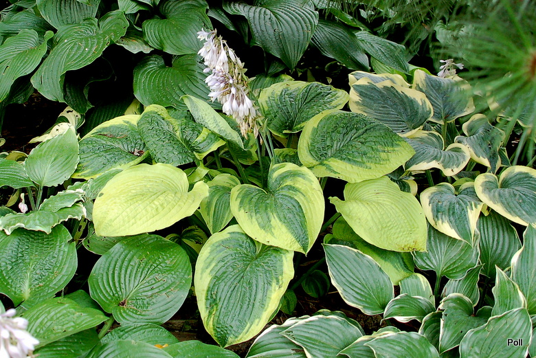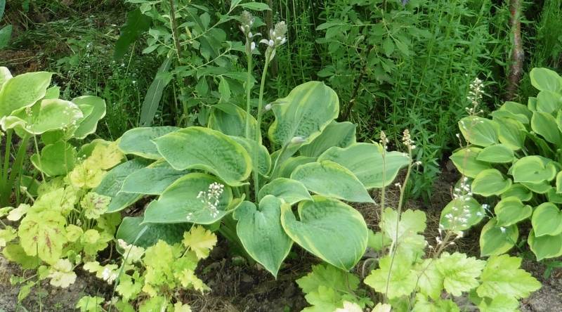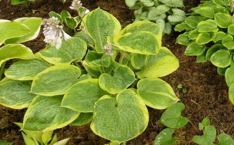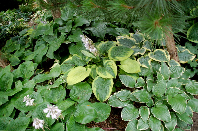 'Laura and Darrell' otoczeniu innych host, na dość suchym, półcienistym stanowisku
