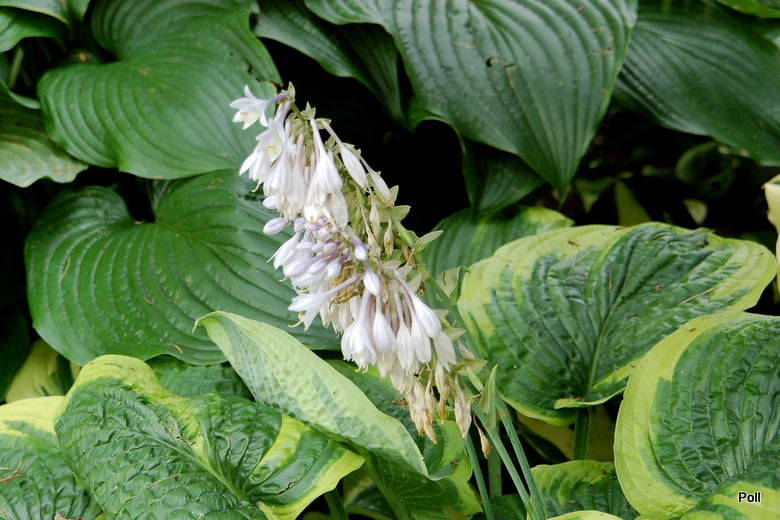 Hosta 'Laura and Darrell' rośnie u mnie od około 8 sezonów, byłą dzielona. Na tle innych host,wyróżnia się właśnie tymi różnymi barwami liści. Wiosną jest nieco bardziej matowa a w raz z upływem sezonu, powłoka znika i liście mocno błyszczą. Dodatkowo, za plus, uważam dość dobrze widoczne , szczególnie u dorosłych egzemplarzy- burchle, czy, jak to mówią inni gufrowanie liści. Kwiaty są przeciętne, niezbyt wysoko wypiętrzone nad kępę i nie mają zbyt wielkich walorów zdobniczych.